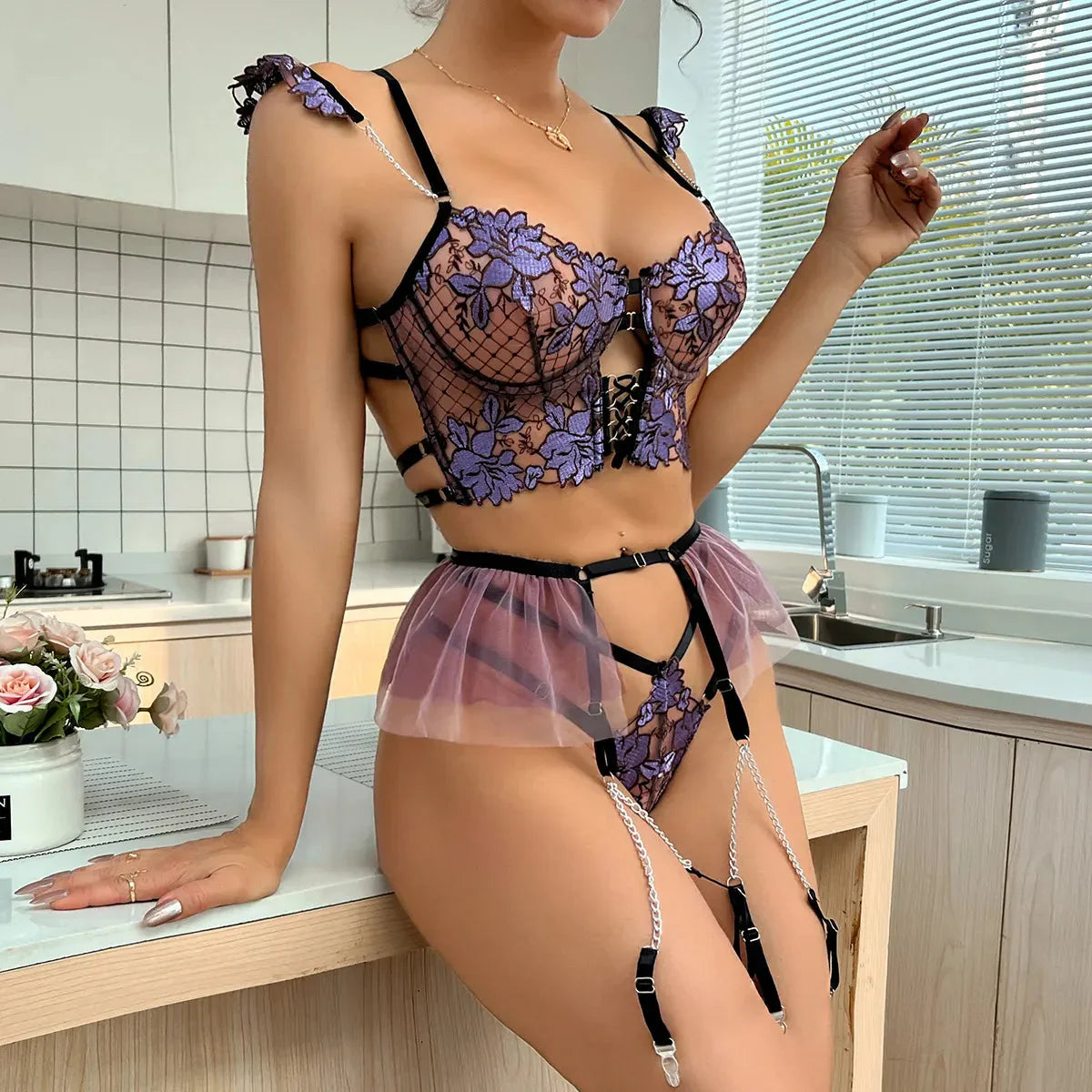 Představujeme neuvěřitelně lákavou třídílnou sadu krajkového spodního prádla s korzetovým topem, ideální pro romantické schůzky, večírky nebo speciální oslavy svátku svatého Valentýna. Tato sada s nastavitelnými ramínky, podprsenkou s krajkovým lemem, sexy tangami a podmanivou fialovou barvou se vyznačuje nejen decentně zdobenými volánky, korzetovým střihem a měkkými košíčky, ale také dalšími ozdobnými ramínky a možností připevnění punčoch.