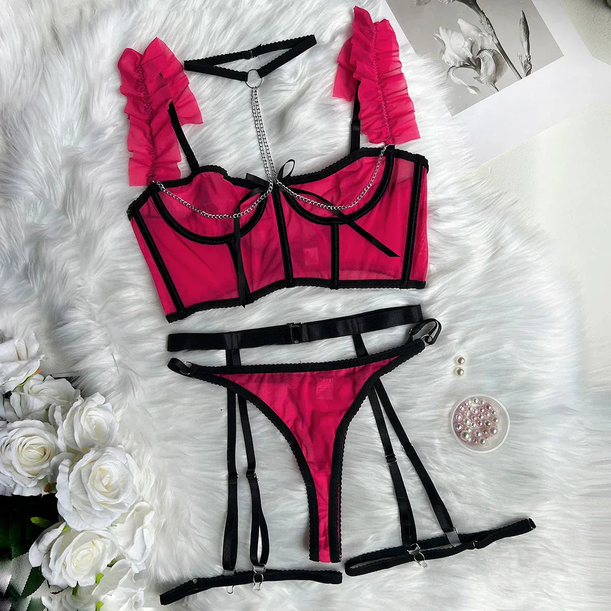 Představujeme neuvěřitelně smyslnou třídílnou síťovanou spodní prádlo, která zdůrazní vaši ženskou eleganci a sebevědomí. S nastavitelnými ramínky, podprsenkou korzetového stylu, svůdnými tangami a jedinečnými detaily, jako je choker, volánky a ozdobné řetízky, je tato sada ideální na rande, Valentýna nebo večírek.