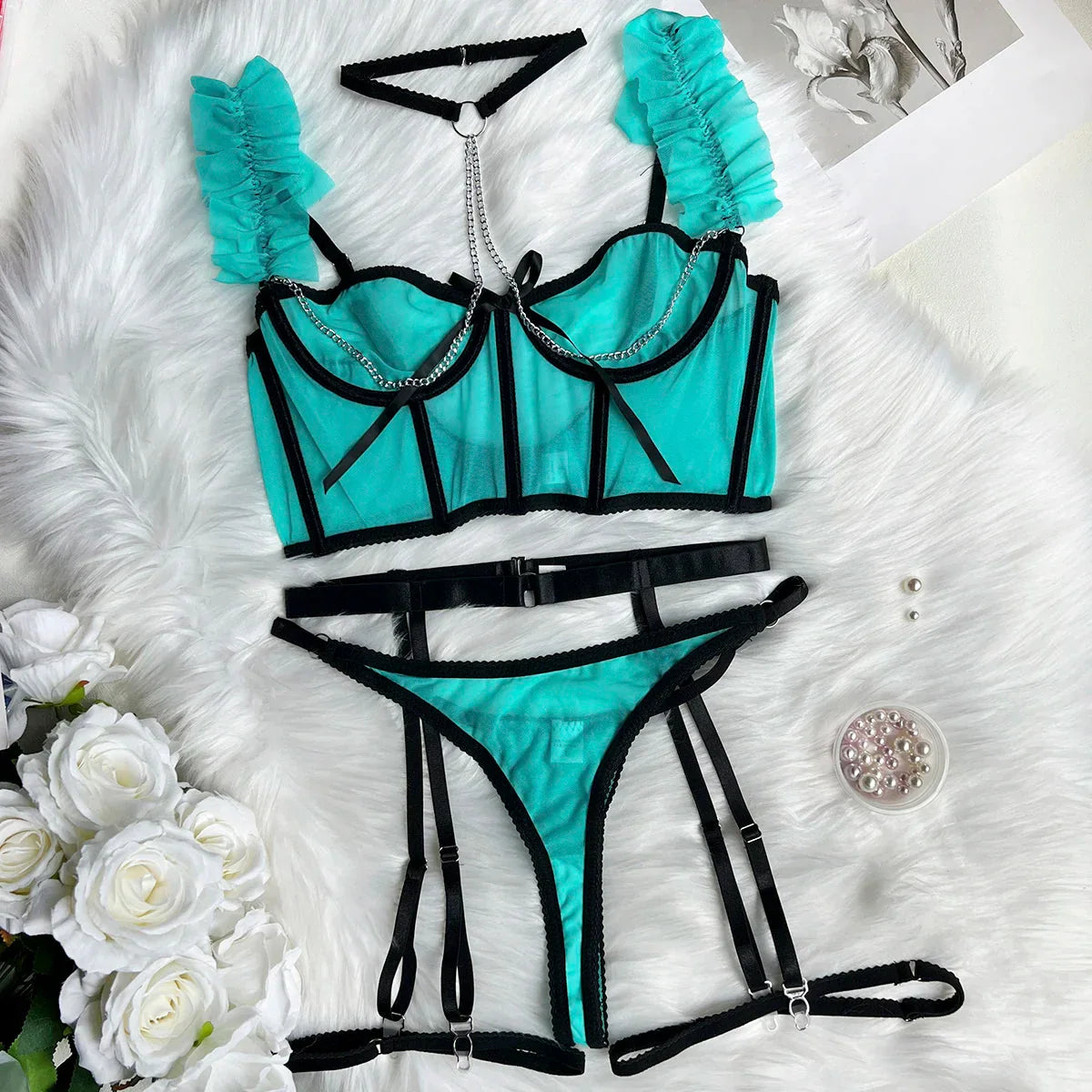 3dílná síťovaná spodní souprava s řetízky a volánky