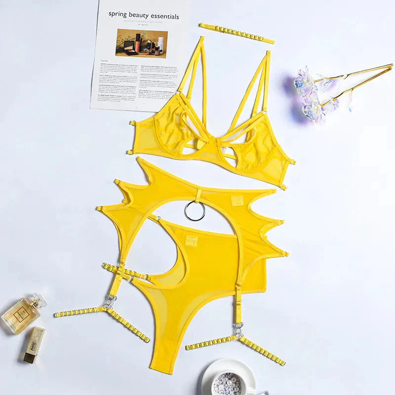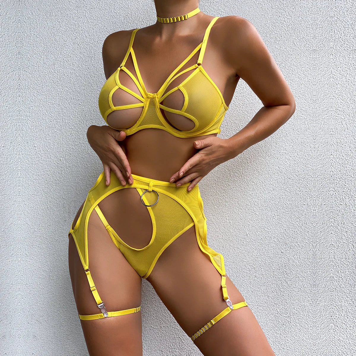 Představujeme neuvěřitelně smyslnou třídílnou síťovanou spodní prádlo s poutavými výřezy, ideální na rande, Valentýna nebo večírky, v odstínech modré, žluté a černé. Nastavitelná ramínka, měkké košíčky podprsenky, okouzlující tanga a podvazky zaručují nezapomenutelný vzhled a nevšední pocity.