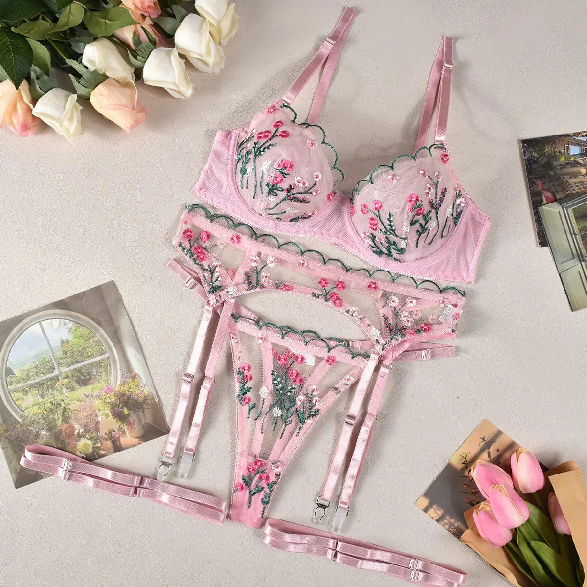 Představujeme neuvěřitelně smyslnou trojdílnou sadu spodního prádla s květinovou výšivkou, která se skládá z krajkové podprsenky, nastavitelných ramínek a svůdných tang. Tato sada v romantickém odstínu růžové vám dodá výjimečné kouzlo na každý okamžik a je ideální na Valentýna nebo romantické rande. Dekorativní krajka, podvazky a květinová výšivka dodávají sadě jedinečné kouzlo.