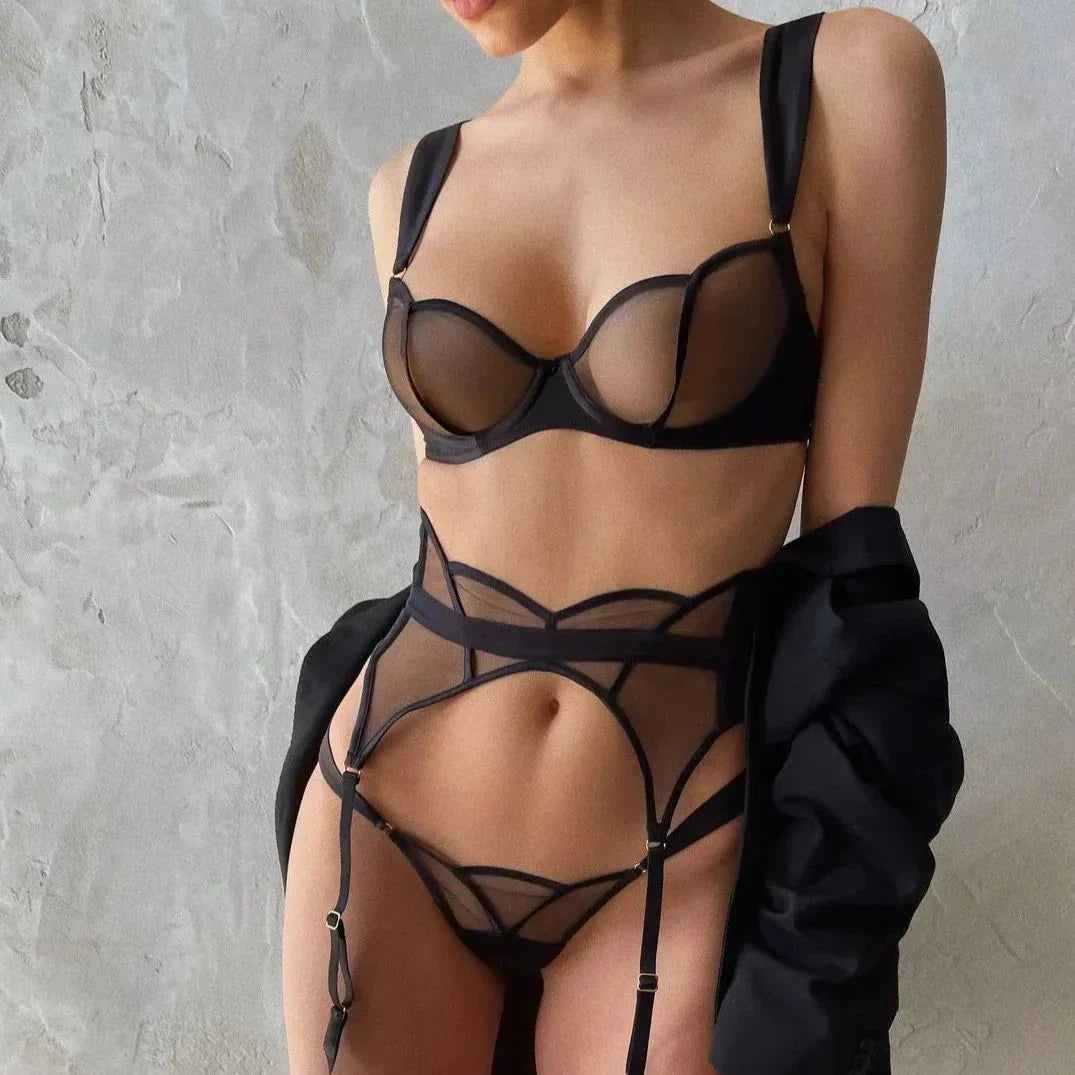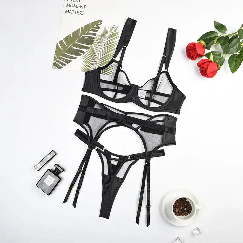 Představujeme unikátní třídílnou sadu jemného síťovaného spodního prádla, která zaručeně rozzáří nejen ložnici, ale i zvláštní příležitosti, jako jsou svatby, rande nebo Valentýn. Nastavitelná ramínka, střih balkonet, okouzlující tanga a černá barva jsou jen některé z jejích předností, zatímco podvazky a měkké košíčky dodávají sadě šarm.