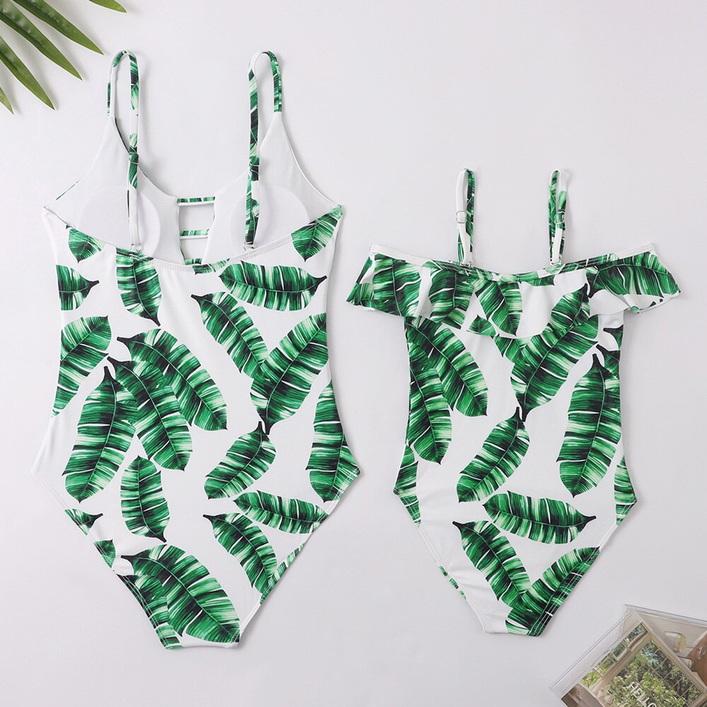 Bílé plavky pro matku a dceru se zelenými listy
