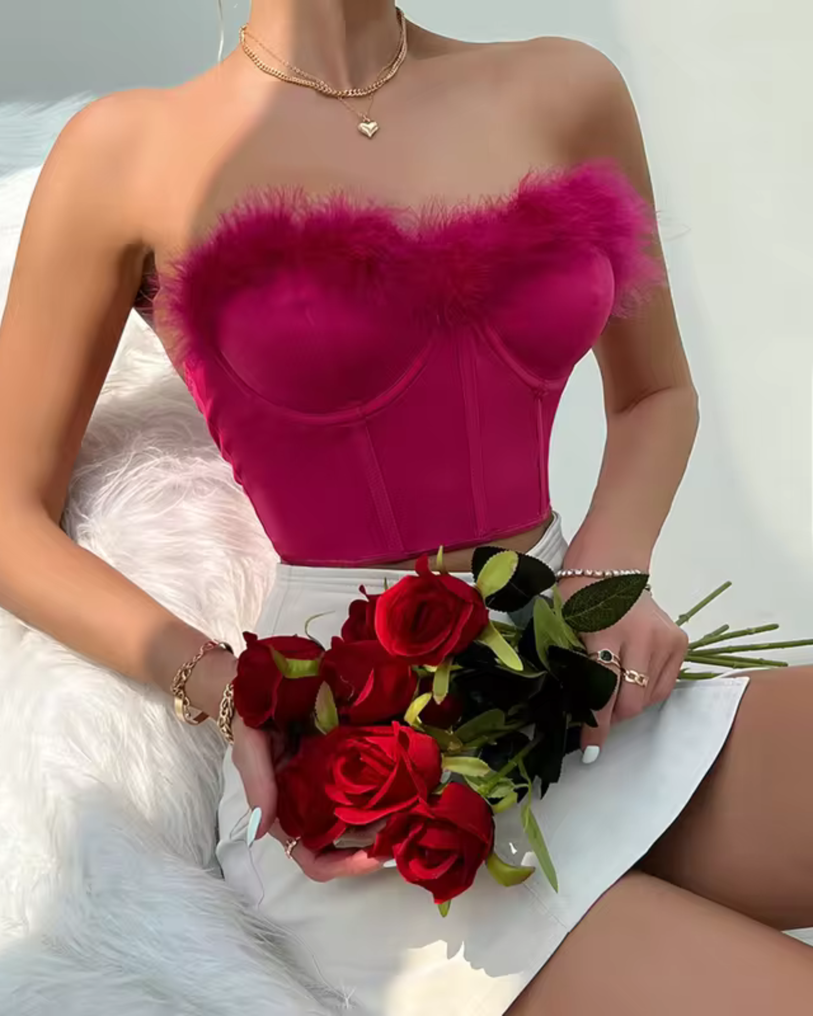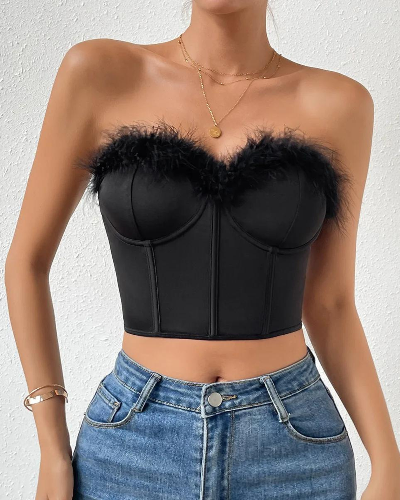 Posuňte svou eleganci na novou úroveň s podprsenkou, která kombinuje klasický styl s nádechem extravagance. Tento smyslný model bez ramínek, zdobený jemnou kožešinou ve výstřihu, dokonale zdůrazní poprsí a dodá vám sebevědomí a sexepíl.