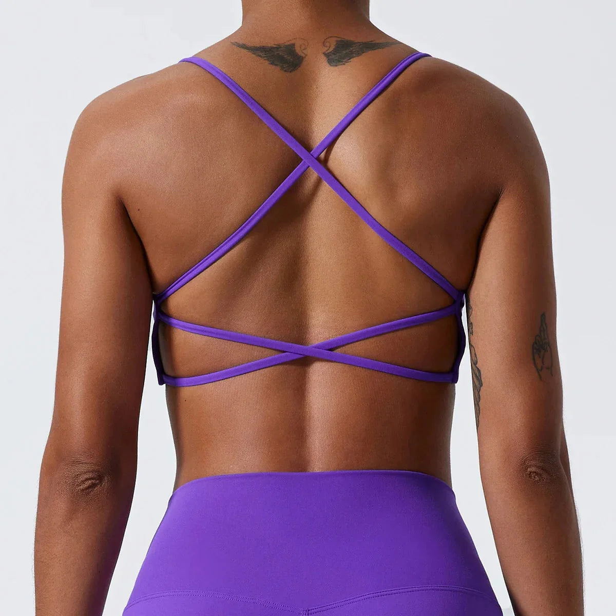 Tato sportovní podprsenka s tenkými ramínky je ideální jak pro aktivní trénink, tak pro každodenní nošení. K dispozici v různých barvách – bílé, fialové, zelené a šedé – nabízí pohodlí a oporu s kulatým výstřihem a ozdobnými zavazováními vzadu, které dodávají podprsence nádech decentní elegance.