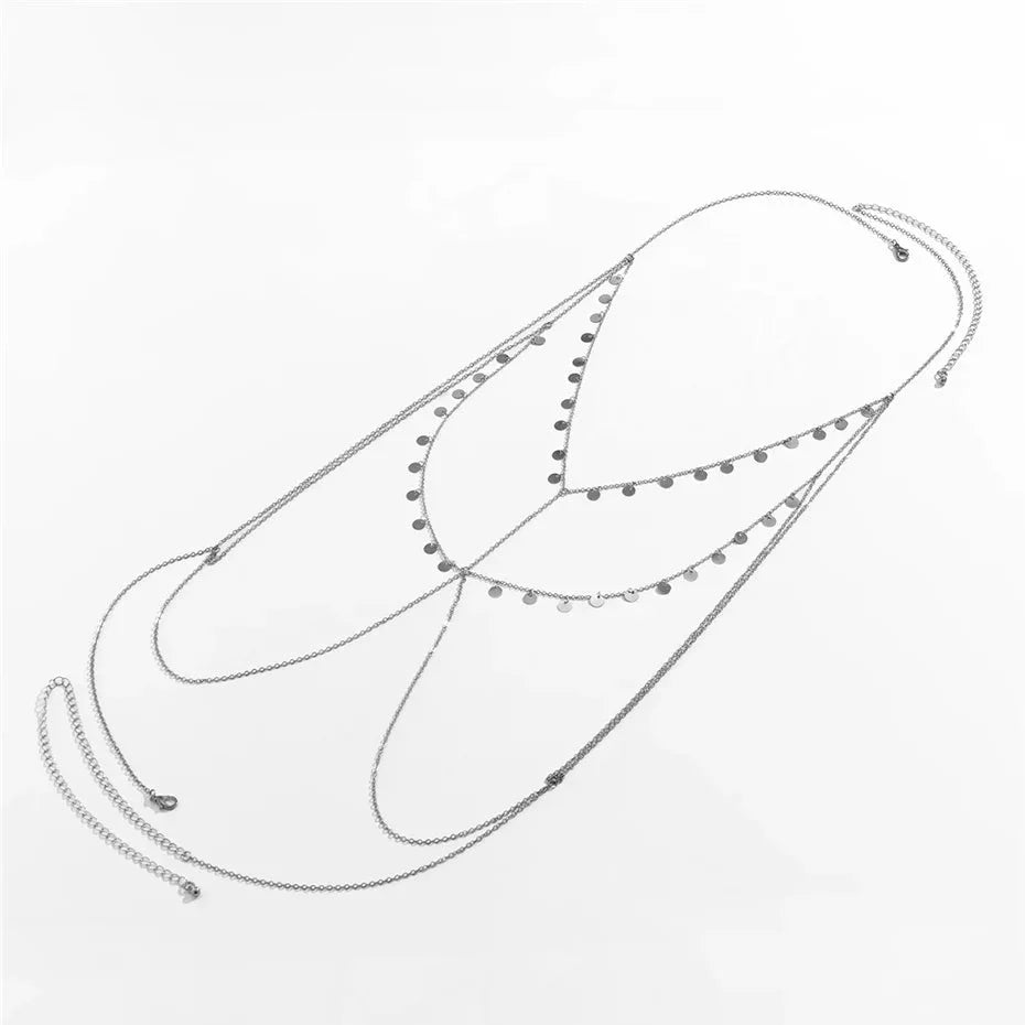 Představujeme tento unikátní náprsník s výraznými flitry, ideální pro různé příležitosti, od večírků a rande až po romantické chvíle na pláži. Tento kousek, dostupný ve zlaté a stříbrné barvě, s unikátními řetízky a třpytivými flitry dodá vašemu outfitu nádech třpytu a elegance.