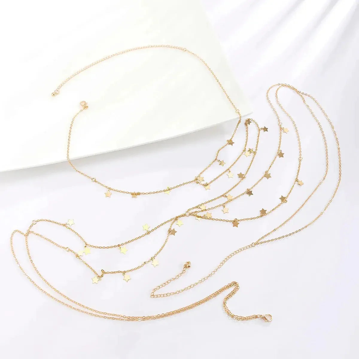 Představujeme unikátní šperky na hrudník s výraznými hvězdami, ideální pro zvláštní příležitosti, jako je večírek, Valentýn, romantické rande nebo relaxace na pláži. Tento šperk ve zlaté barvě vyniká svými flitry a řetízky a dodává eleganci každému outfitu.