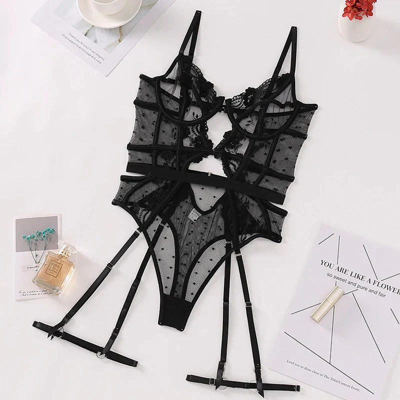 Toto neuvěřitelně smyslné černé krajkové body je ideální na rande, Valentýna nebo večírek. S puntíkovaným vzorem, nastavitelnými ramínky a výstřihem ve tvaru srdce se vyznačuje výraznými výřezy a decentně zakončenými ramínky na stehnech, díky nimž se budete cítit výjimečně žensky a sebevědomě.