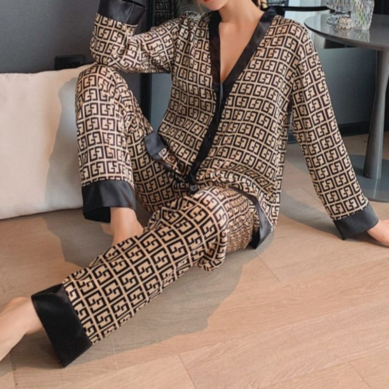 Objevte kouzlo luxusu a pohodlí s naším dámským saténovým pyžamem v hnědé barvě s jedinečným geometrickým vzorem. Vyrobeno z měkké a prodyšné látky, dokonale přiléhá k tělu a zaručuje naprosté pohodlí po celý rok. Dlouhé rukávy a nohavice jsou ideální pro každé roční období – od teplých jarních večerů, přes letní noci až po chladnější podzimní a zimní dny. Výstřih do V dodává decentní eleganci, zatímco volný střih umožňuje naprostou volnost pohybu. Toto pyžamo je perfektní volbou pro večerní zábavu, jako dárek na Valentýna nebo i jen tak pro každodenní nošení.