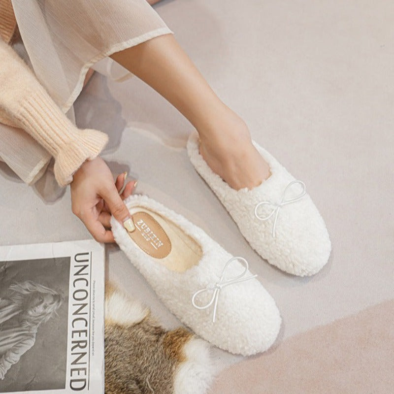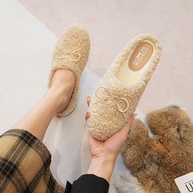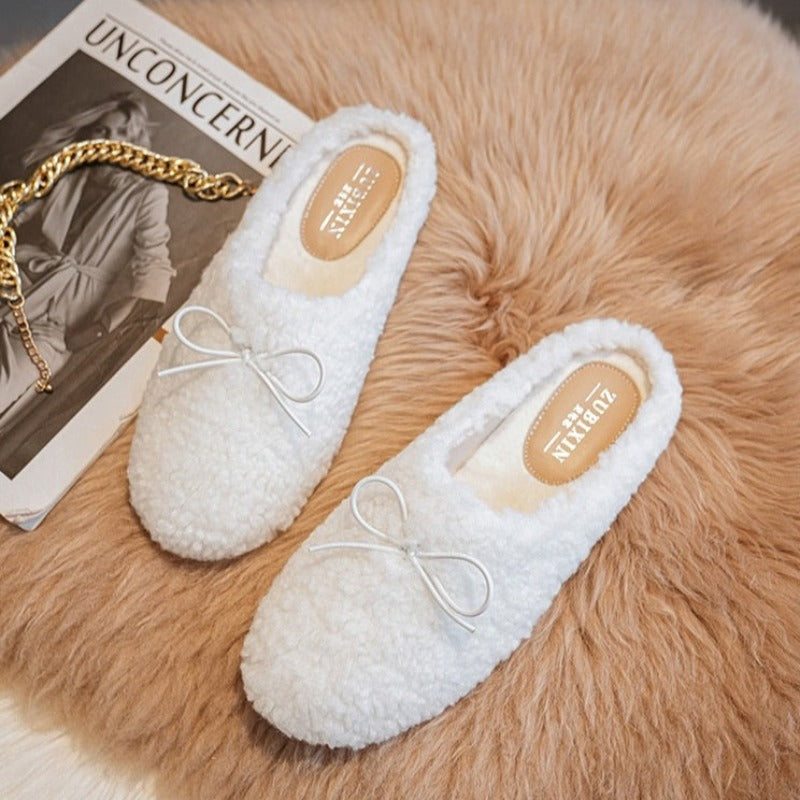 Teplé kožešinové pantofle s mašlí