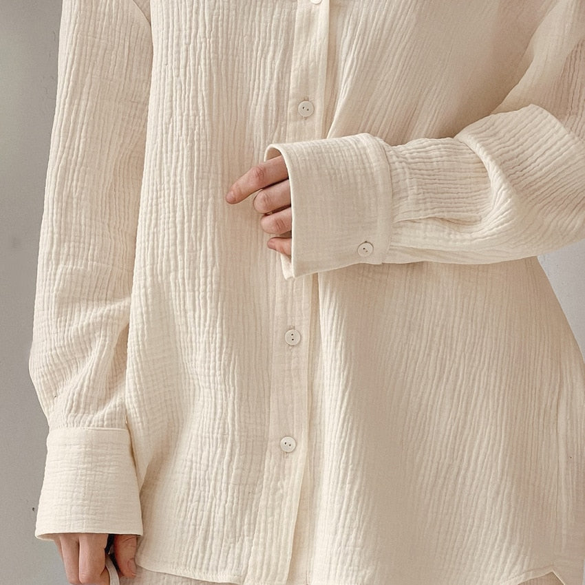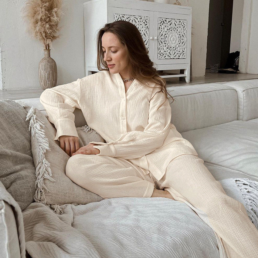 Objevte naše mimořádně pohodlné dlouhé bavlněné pyžamo s košilí, které je ideální pro každodenní nošení a zajistí vám dobrý spánek po celý rok. Toto pyžamo s límečkem, dlouhým rukávem a dlouhými nohavicemi je dostupné v tlumených odstínech béžové a zelené a je nejen neuvěřitelně pohodlné na nošení, ale také praktické díky zapínání na knoflíky.