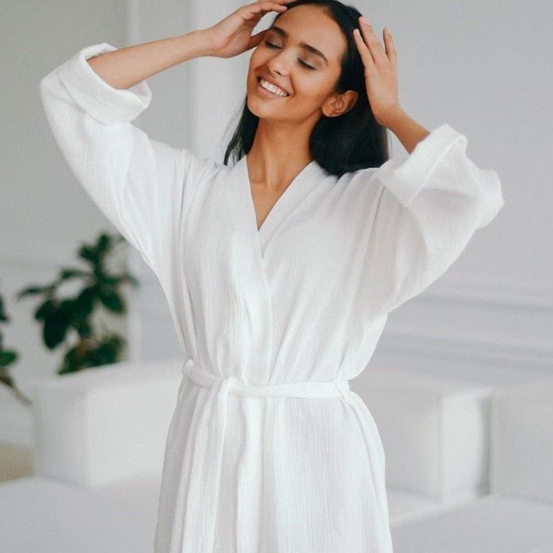 Tento měkký župan je ztělesněním pohodlí a relaxace, ideální pro každou příležitost – od uložení do postele až po klidné ráno. K dispozici ve dvou klasických barvách, bílé a šedé, má dlouhé rukávy a délku, která poskytuje plné zakrytí.