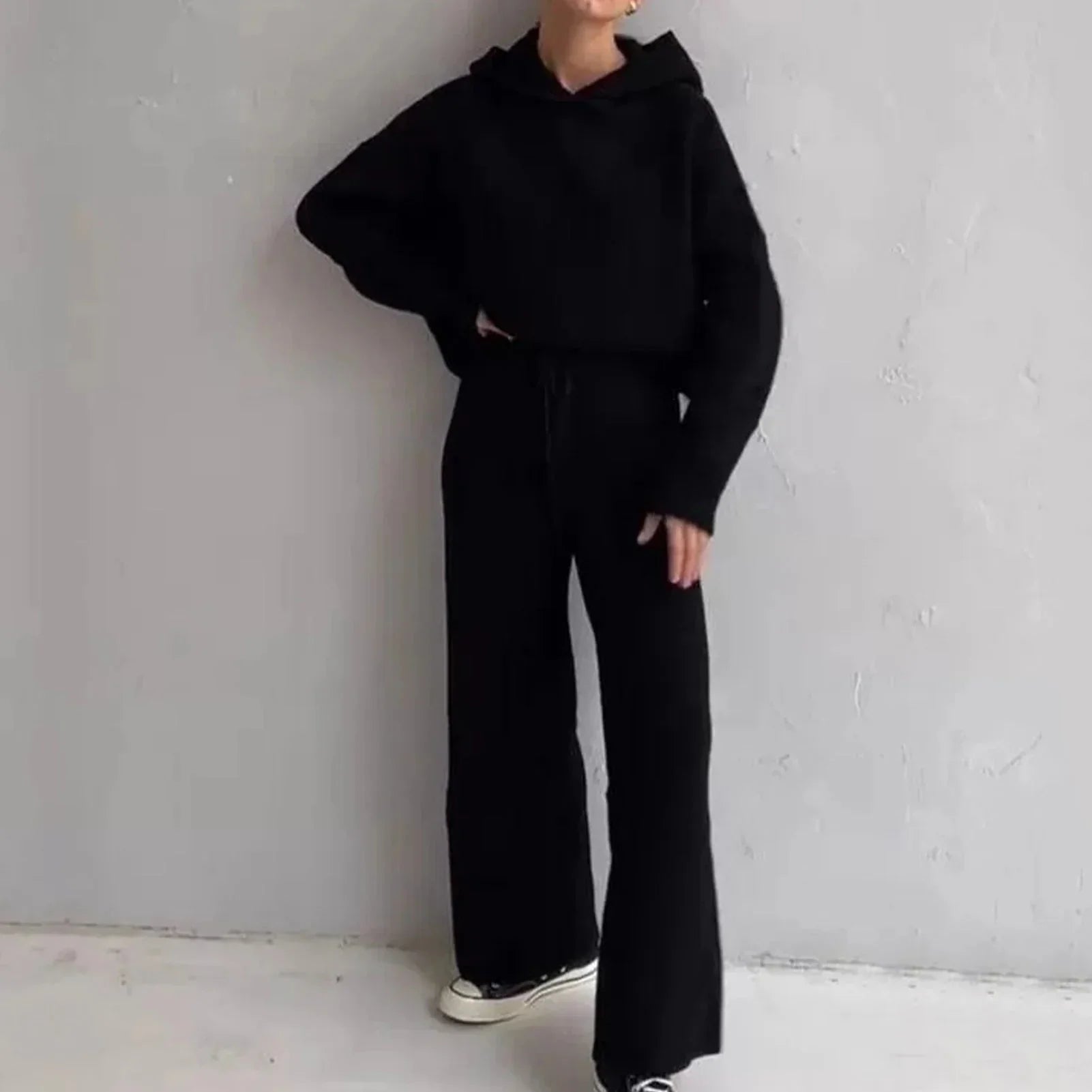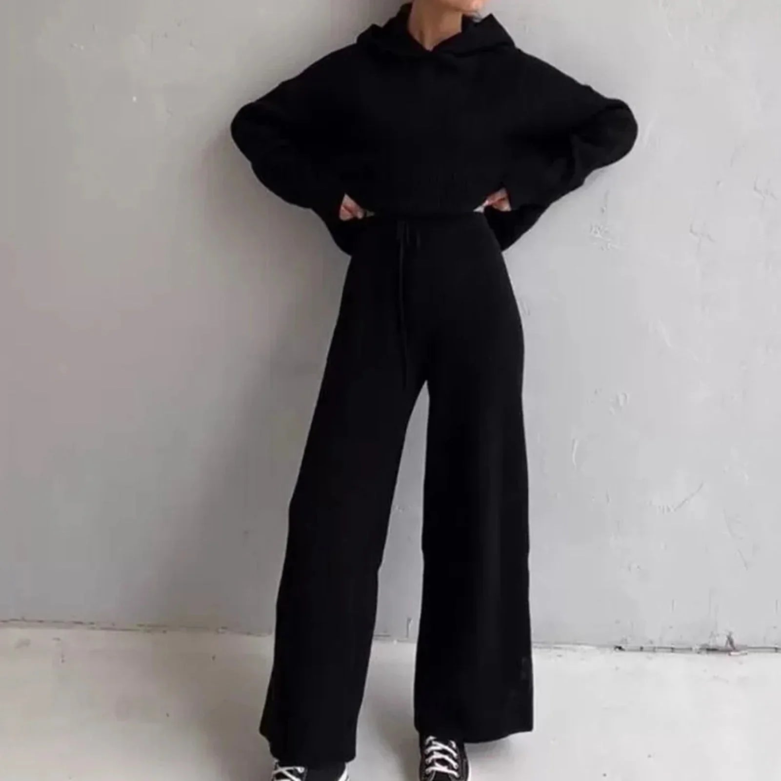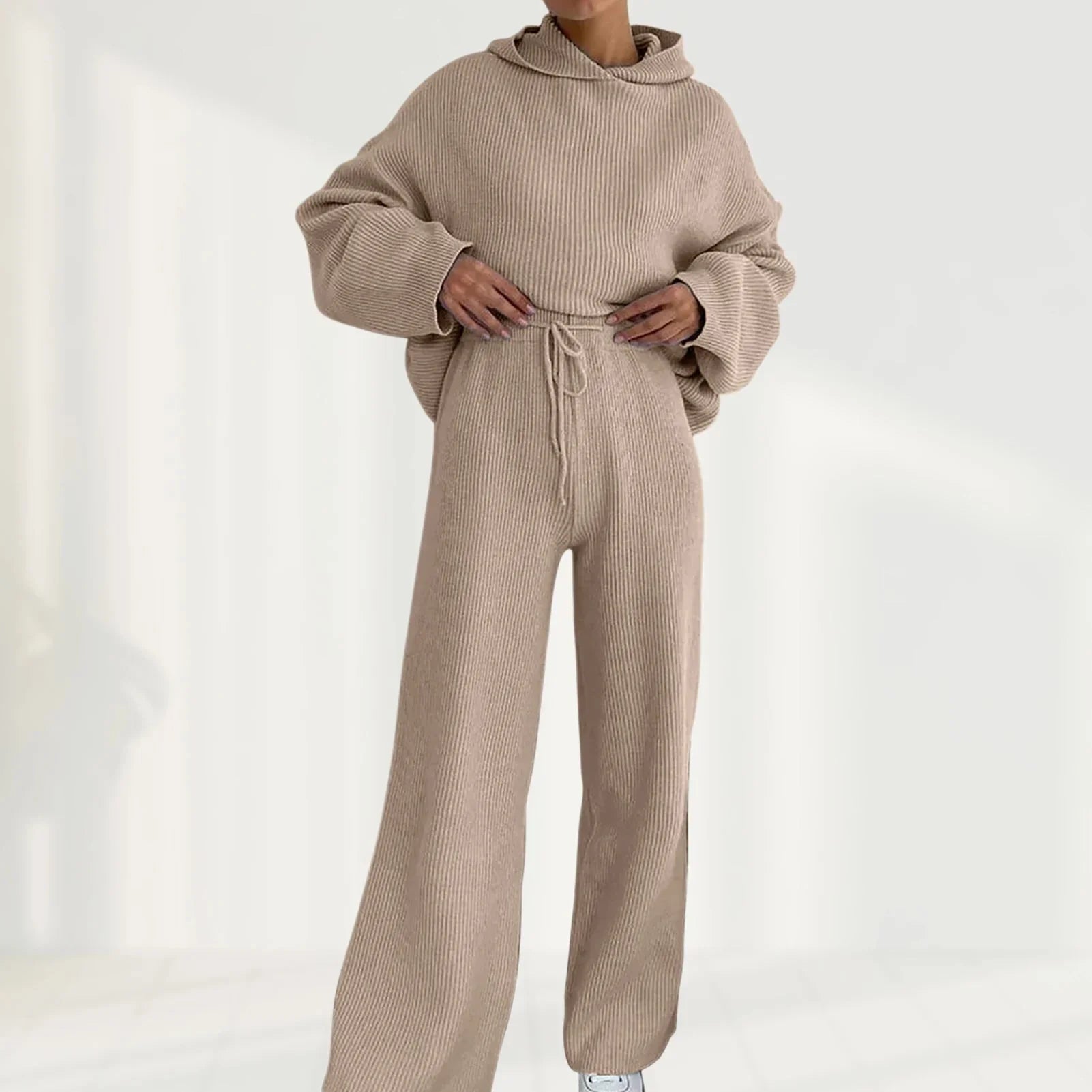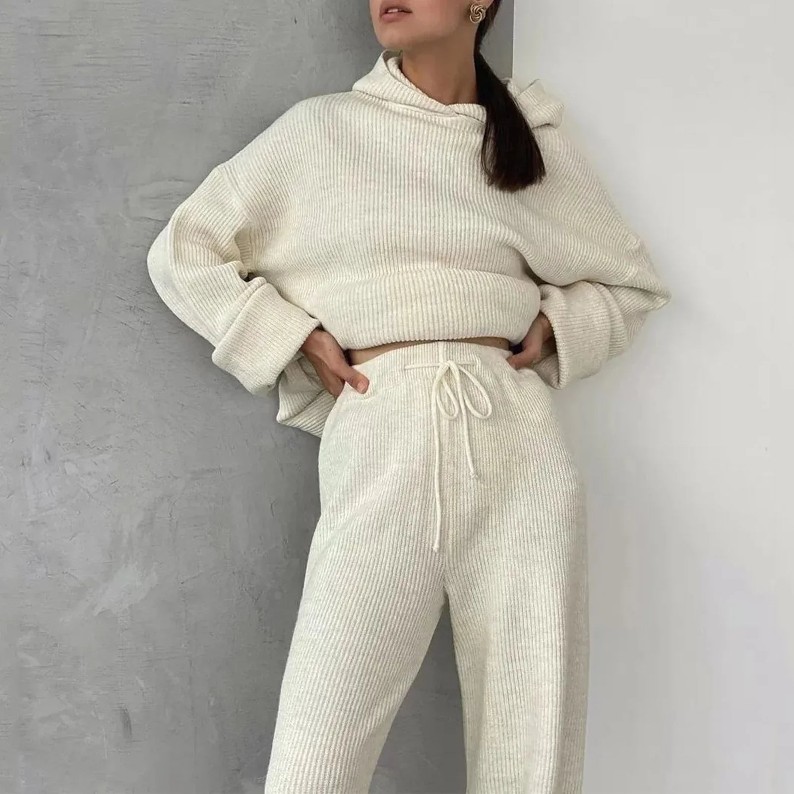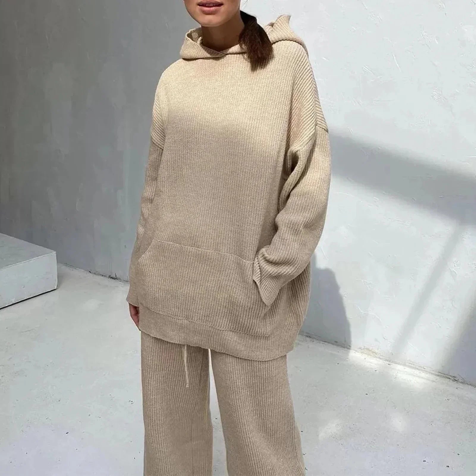 Představujeme mimořádně pohodlnou soupravu dlouhého pleteného oblečení na doma, ideální pro každodenní relaxaci v chladnějších podzimních a zimních dnech. Tato souprava v klasických odstínech béžové, bílé, modré a černé s kulatým výstřihem, dlouhými rukávy, dlouhými nohavicemi, žebrovanou texturou, kapucí a kapsou v sobě spojuje pohodlí a styl.