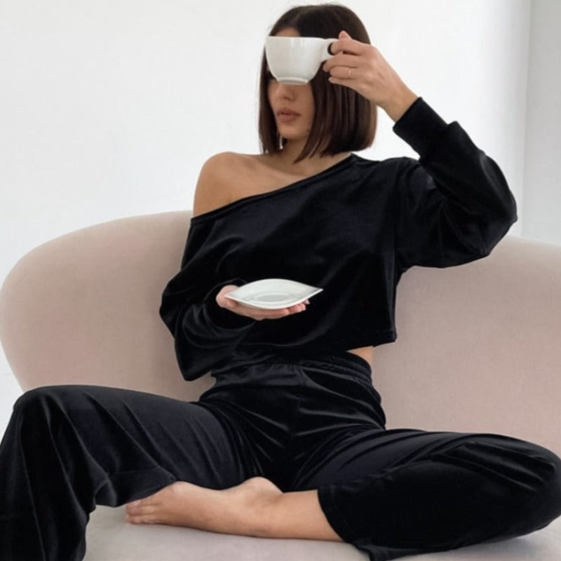 Černá souprava je symbolem elegance a pohodlí, ideální pro každou příležitost, ať jste kdekoli. Střih s odhalenými rameny dodává tomuto setu jedinečný charakter a zdůrazňuje vaši jemnost a sebevědomí. Dlouhé rukávy a dlouhé nohavice poskytují výjimečné pohodlí, zatímco sametový materiál vás zahalí do hebkosti.