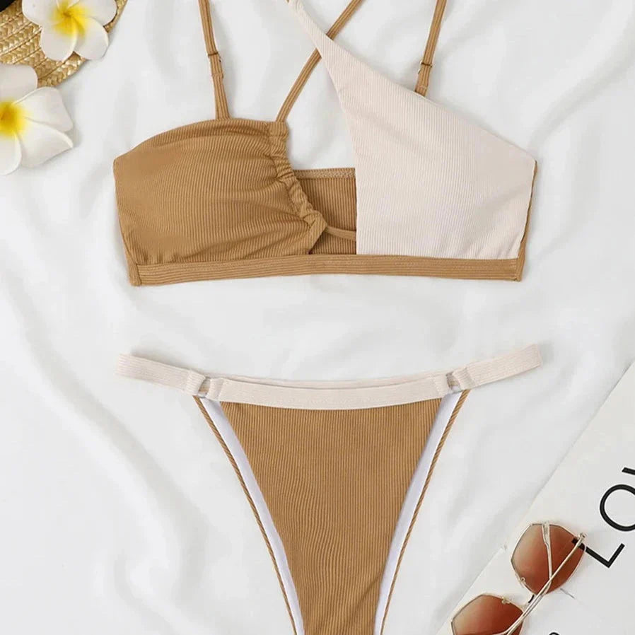 Tyto dvoudílné kontrastní bikiny jsou ideální pro každodenní dovolenou, dny na pláži nebo relaxaci u bazénu. Tato asymetrická sada podprsenky a kalhotek je k dispozici v různých barvách – béžové, oranžové, modré a černé – a vyznačuje se hladkým vzorem a žebrovanou texturou, které dodají vašemu letnímu outfitu jedinečný nádech.