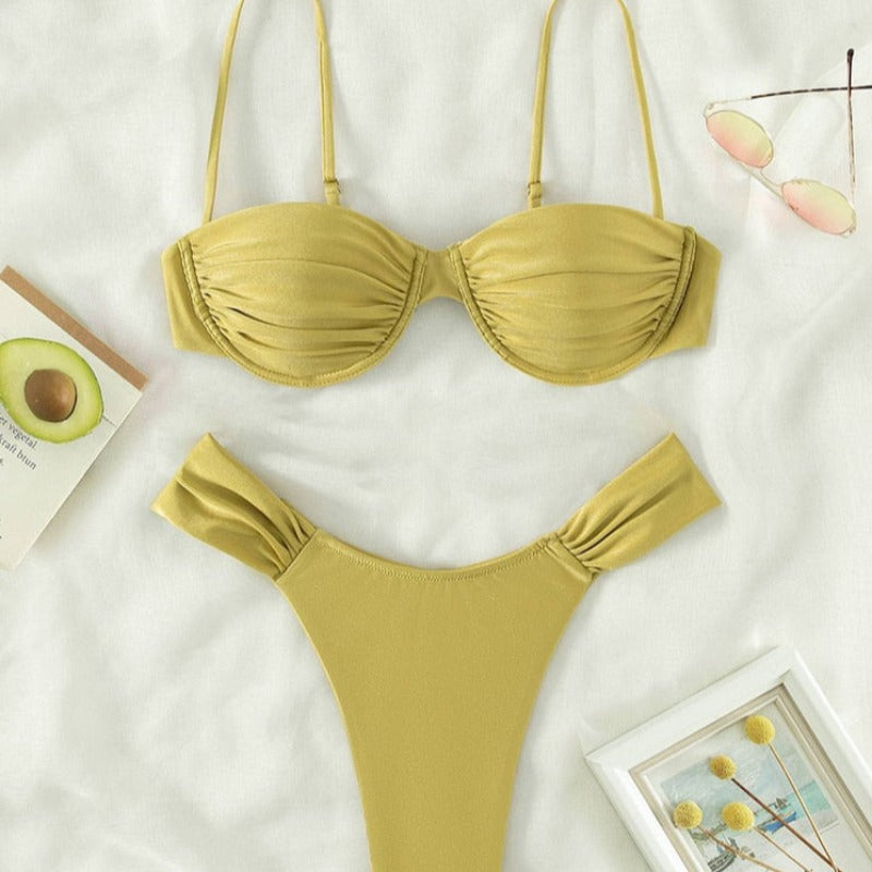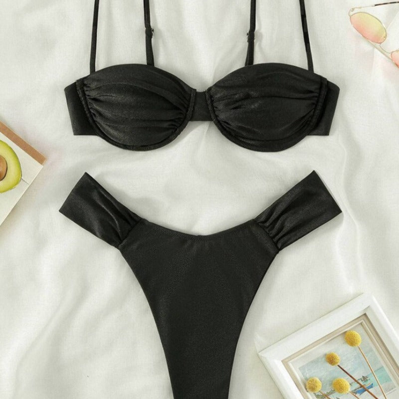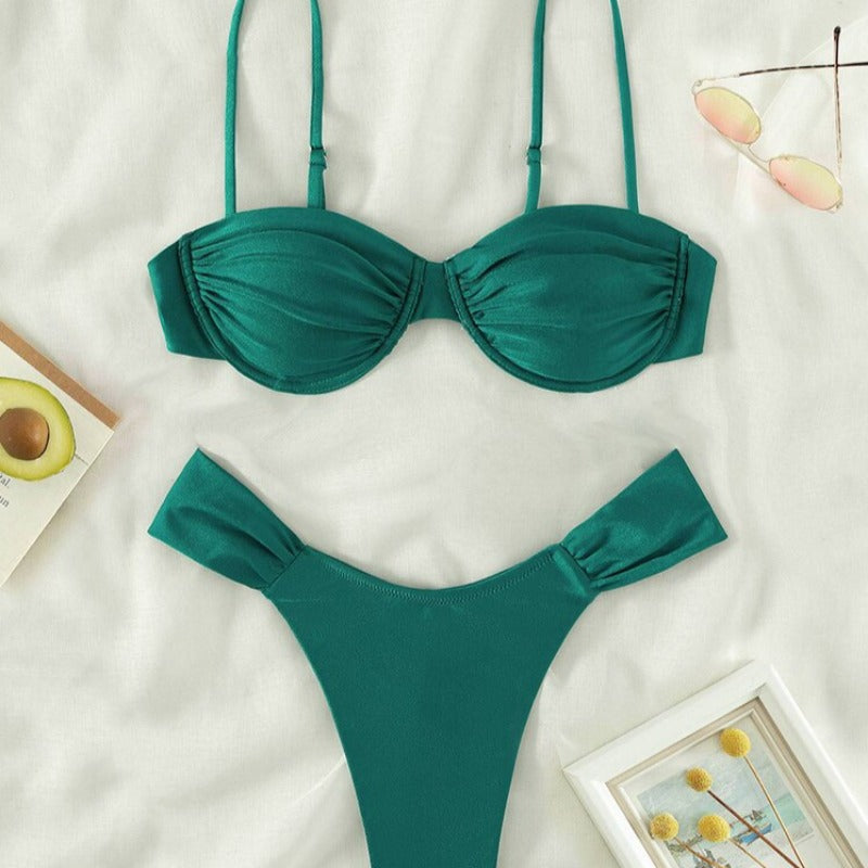 Podprsenka má polstrovanou konstrukci pro lepší oporu a volánky pro větší atraktivitu. Podprsenka se také zavazuje vzadu a má nastavitelná ramínka, takže si ji snadno přizpůsobíte své velikosti. Kalhotky jsou úzké a odhalují větší část hýždí, což je typické pro brazilský styl. Boky kalhotek jsou také volánky. Celé plavky jsou vyrobeny z hladkého materiálu, který umocňuje jejich elegantní a stylový vzhled. Je to perfektní střih pro ženy, které chtějí vypadat módně a atraktivně na pláži nebo u bazénu.