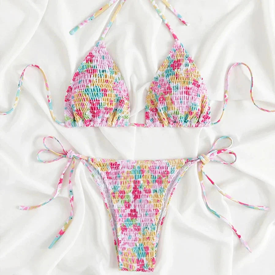 Dvoudílné bikiny s květinovým vzorem a volánky