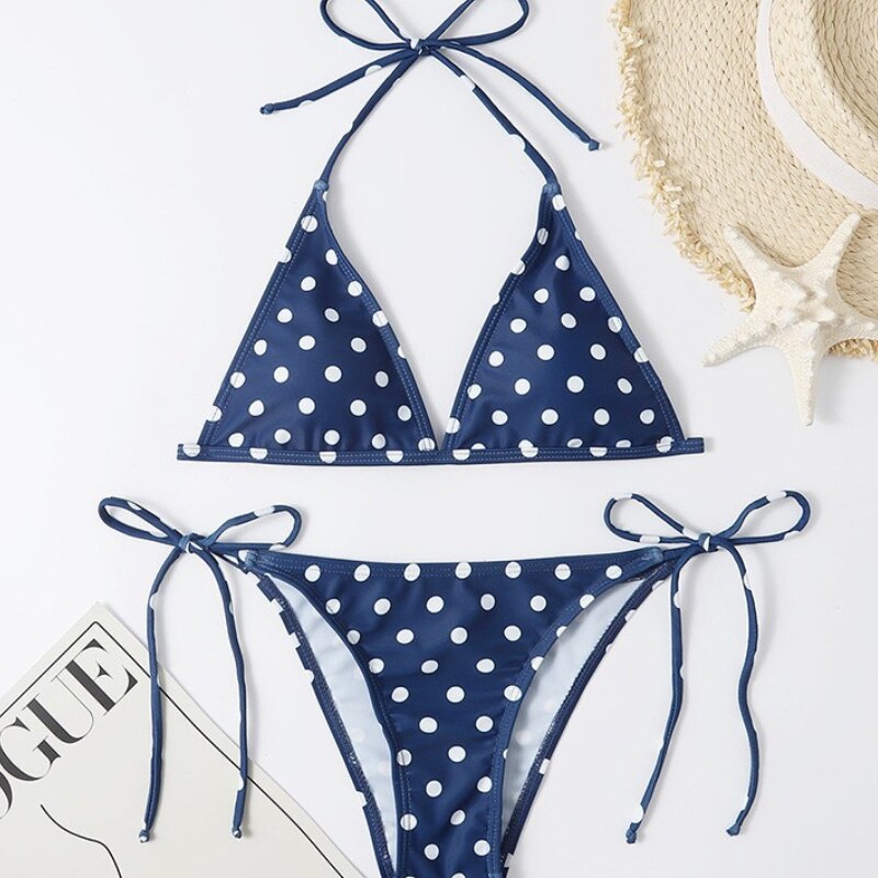 Naše bikiny s puntíkovaným vzorem se skládají z podprsenky a kalhotek s puntíkovaným vzorem. Podprsenka má trojúhelníkové košíčky, které jsou lehce vyztužené pro oporu. Zavazuje se na zádech a krku, což umožňuje nastavitelný střih a přizpůsobení střihu. Kalhotky mají střih slipů a po stranách zavazování pro pohodlný a nastavitelný pas. Bikiny s puntíkovaným vzorem jsou velmi módní a stylovou volbou na léto, ideální pro ty, které mají rády klasický střih s moderním střihem.