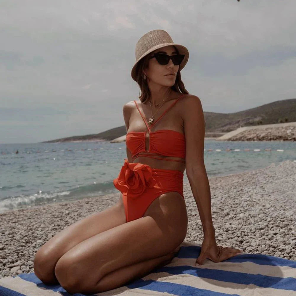 Dvoudílné bikiny s vysokým pasem a zavazováním s květinovým detailem