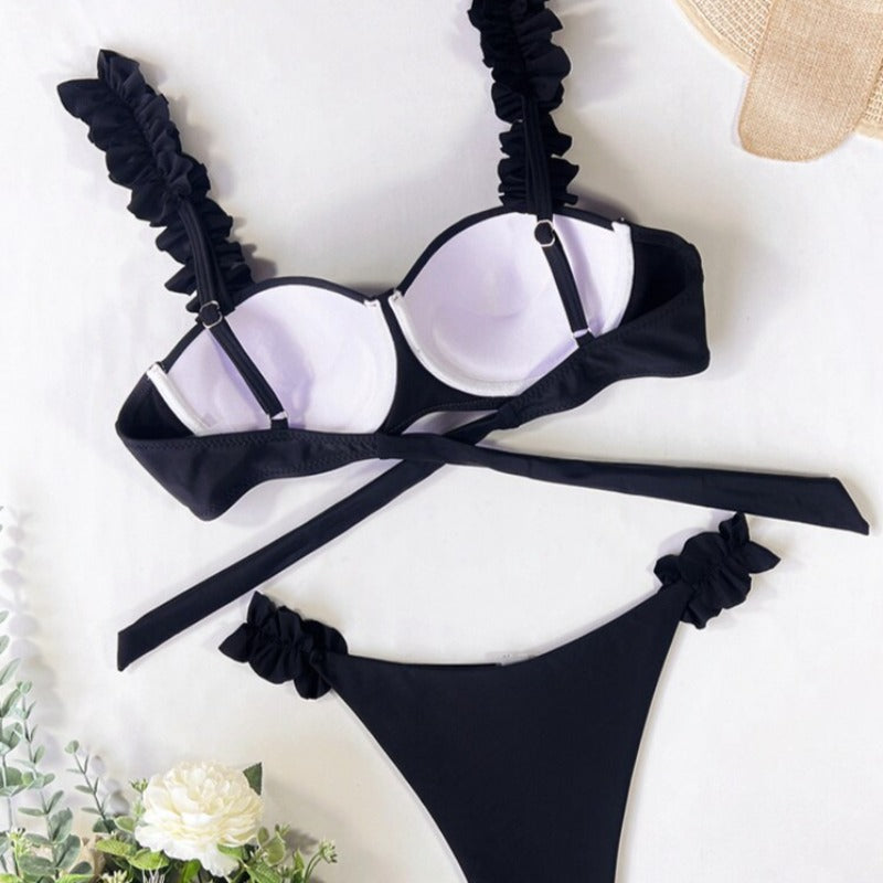 Volánkové bikiny jsou perfektní letní volbou. Skládají se z vyztužené push-up podprsenky s ramínky a kalhotek. Podprsenka je navržena tak, aby zvedla a zvýraznila poprsí, díky čemuž se ženy na pláži cítí sebevědoměji a atraktivněji. Kalhotky jsou klasické, aby vyvážily siluetu. Vzor bikin je jednoduchý, což jim dodává elegantní a jednoduchý vzhled. Charakteristickým prvkem těchto bikin jsou volánky, které se nacházejí na ramínkách a bocích kalhotek. Volány dodávají outfitu nádech jemnosti a romantiky, takže jsou ideální volbou pro ženy, které preferují dívčí a romantický styl.