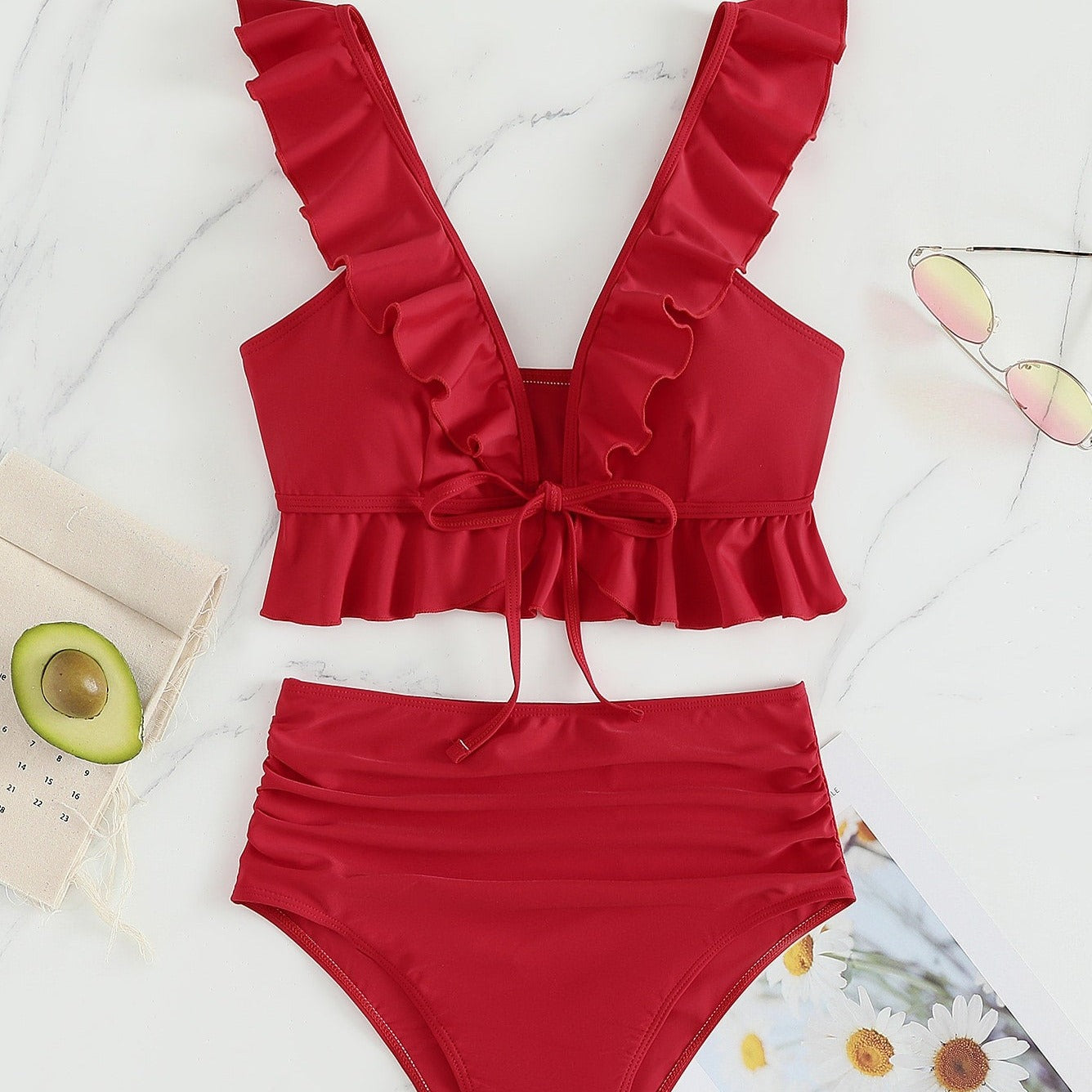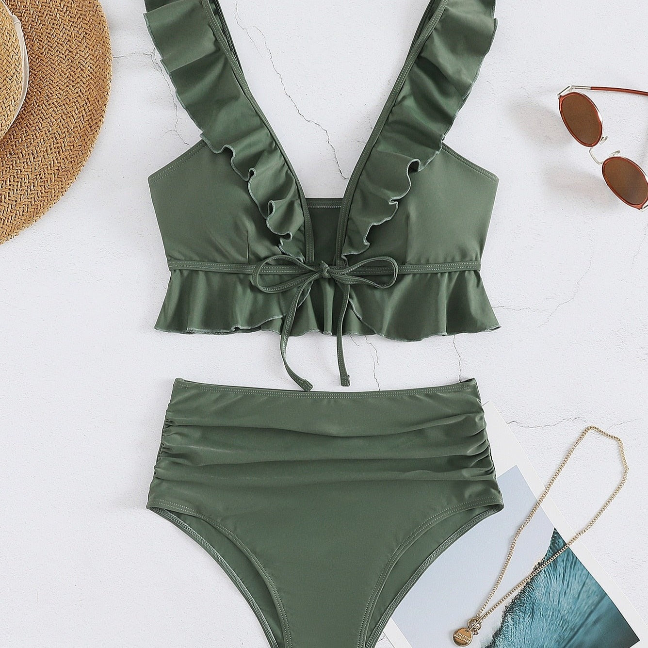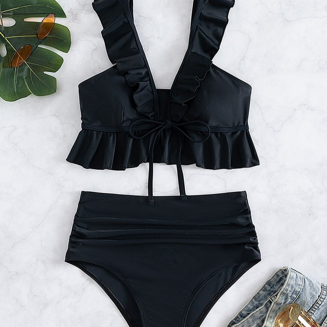 Pokud se chcete na pláži cítit žensky, elegantně a krásně, tyto dvoudílné plavky s volánky jsou pro vás. Celý kousek má hladký vzor, ​​který zdůrazňuje jeho jednoduchost a eleganci. Vyztužená podprsenka poskytuje prsům dodatečnou oporu a tvar. Lze ji vpředu zavázat, takže si ji snadno přizpůsobíte individuálním potřebám. Největší ozdobou jsou však volánky na ramínkách. Volány dodávají podprsence lehký a jemný nádech a dodávají plavkám velmi dívčí vzhled. Kalhotky s vysokým pasem jsou velmi módní a pohodlné na nošení, s volánky po stranách. Tyto plavky jsou ideální pro ženy, které si na pláži cení elegantního a zároveň romantického vzhledu.