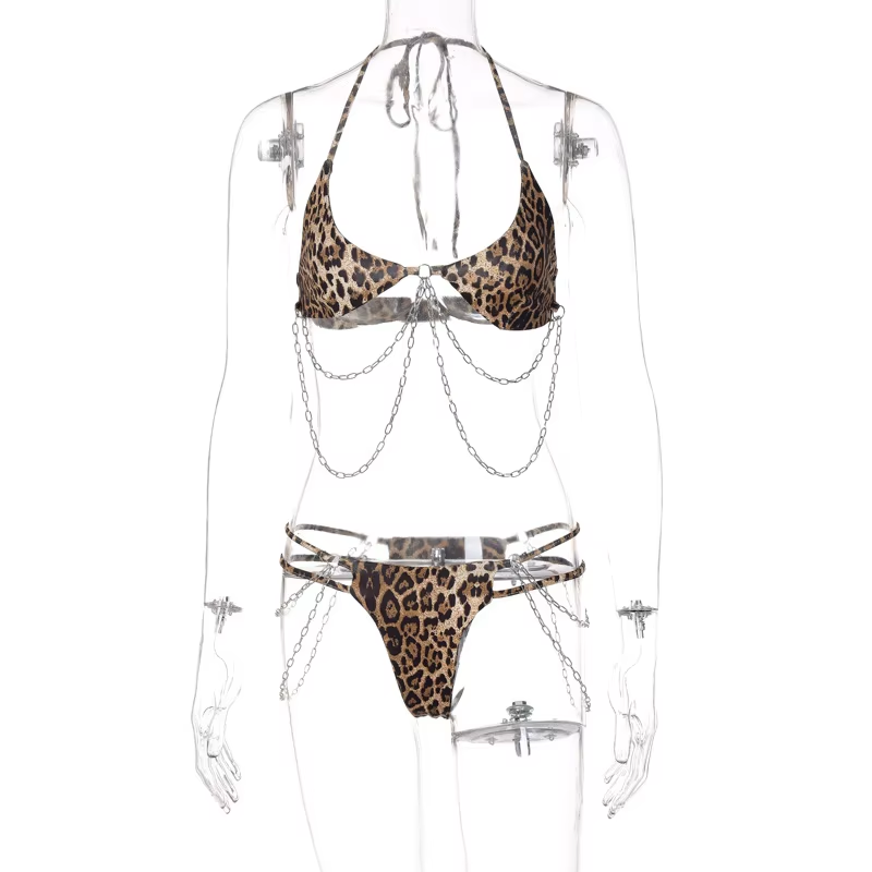 Tyto dvoudílné bikiny v elegantní hnědé barvě jsou ideální nejen na pláž, k bazénu nebo na dovolenou, ale i pro každodenní nošení. Leopardí vzor jim dodává jedinečné kouzlo, zatímco trojúhelníkové košíčky a tanga jim dodávají sexy vzhled. Ozdobná ramínka a řetízky dodávají jemnou eleganci a charakter.