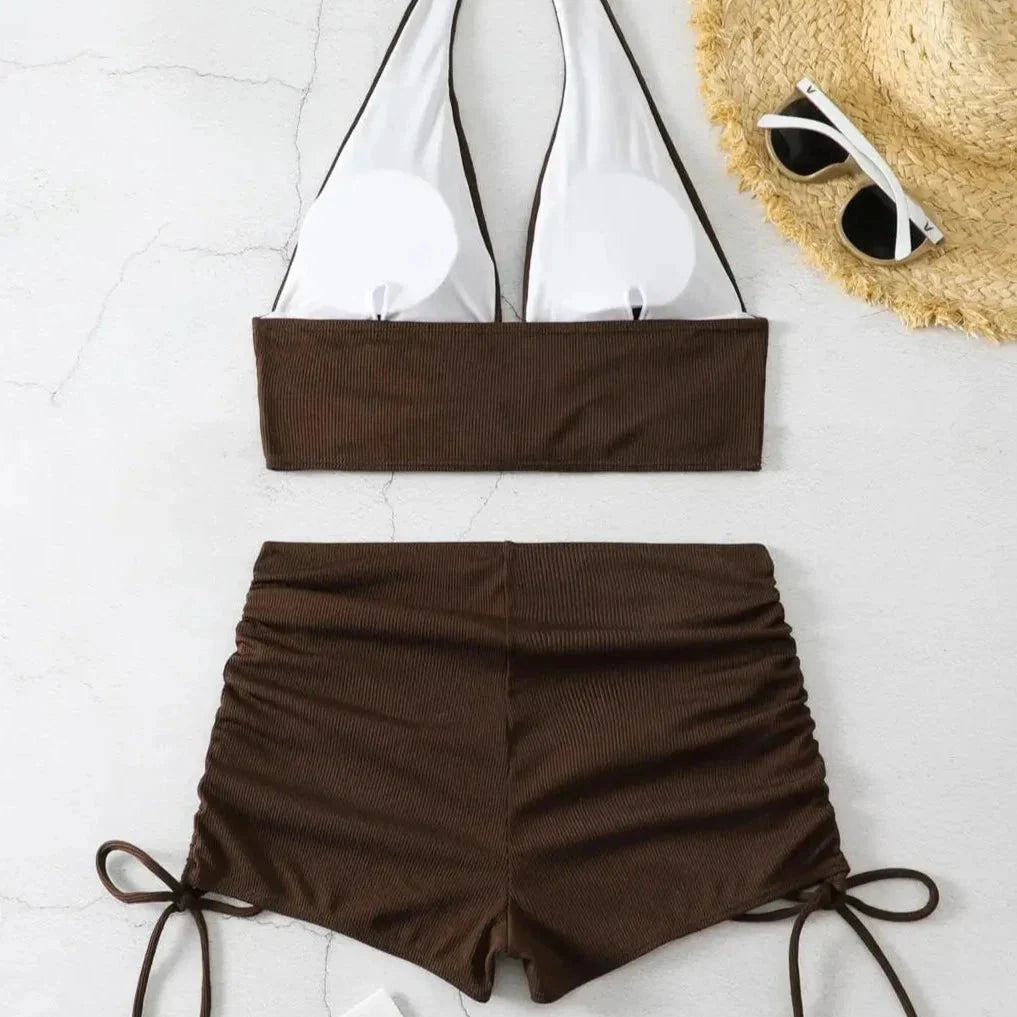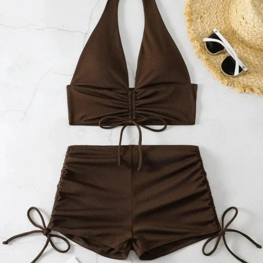Nabízíme elegantní dvoudílné bikiny s jemným volánem, ideální pro každodenní dobrodružství na dovolené, dny na pláži i lenošení u bazénu. Tyto elegantní plavky s měkkou hnědou podprsenkou a kraťasy mají žebrovanou texturu a nastavitelné volánky, které se přizpůsobí vašim preferencím a zvýrazní vaši postavu.