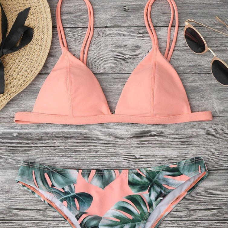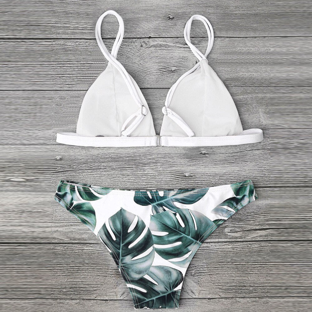 Viditelné plavky, které jsou perfektní volbou pro každou ženu, která se chce cítit pohodlně a stylově na pláži nebo u bazénu. Tyto dvoudílné plavky se skládají z podprsenky a kalhotek. Podprsenka má jednolitý střih, bez dalších potisků, zatímco kalhotky a spodní díl zdobí květinový motiv. Vzor listů dodává bikinám tropický nádech a atmosféru dovolené. Podprsenka bikin je bez vyztužení, zatímco kalhotky mají tvar kalhotek a nabízejí klasický, přiléhavý střih.