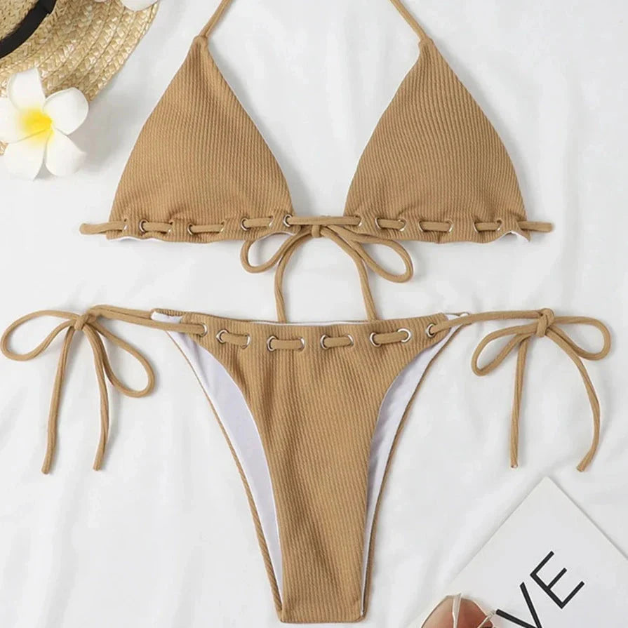 Představujeme dvoudílné bikiny v elegantní hnědé barvě, ideální pro každou příležitost – od každodenního nošení na pláži až po letní dovolenou nebo relaxaci u bazénu. Tato elegantní souprava, která obsahuje trojúhelníkovou podprsenku a krátké kalhotky, je doplněna ozdobným zavazováním pro větší šarm a styl.