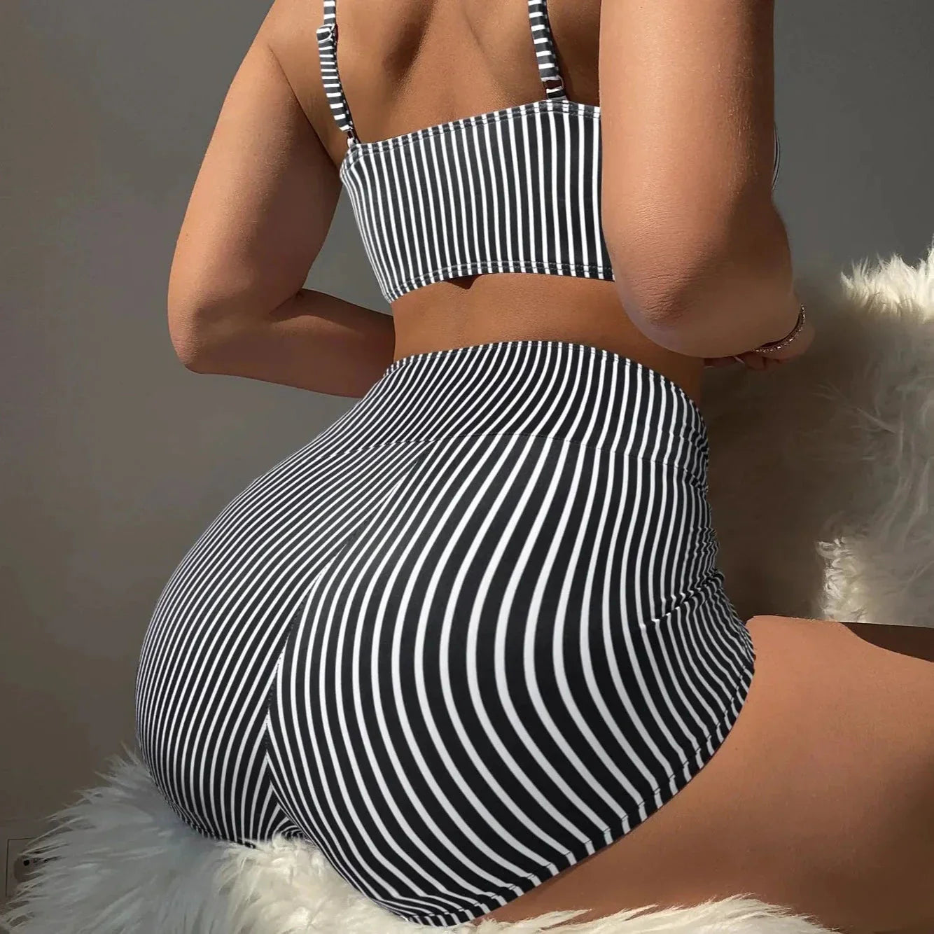 Tyto dvoudílné plavky z bikin a kraťasů vám poskytnou styl a pohodlí pro každodenní nošení, ať už jste na dovolené, na pláži nebo u bazénu. Podprsenka a kraťasy s měkkými košíčky jsou k dispozici v modré a černé barvě s pruhovaným vzorem a nabízejí nejen módní vzhled, ale i pohodlí. Nastavitelné volány navíc zajišťují perfektní střih.