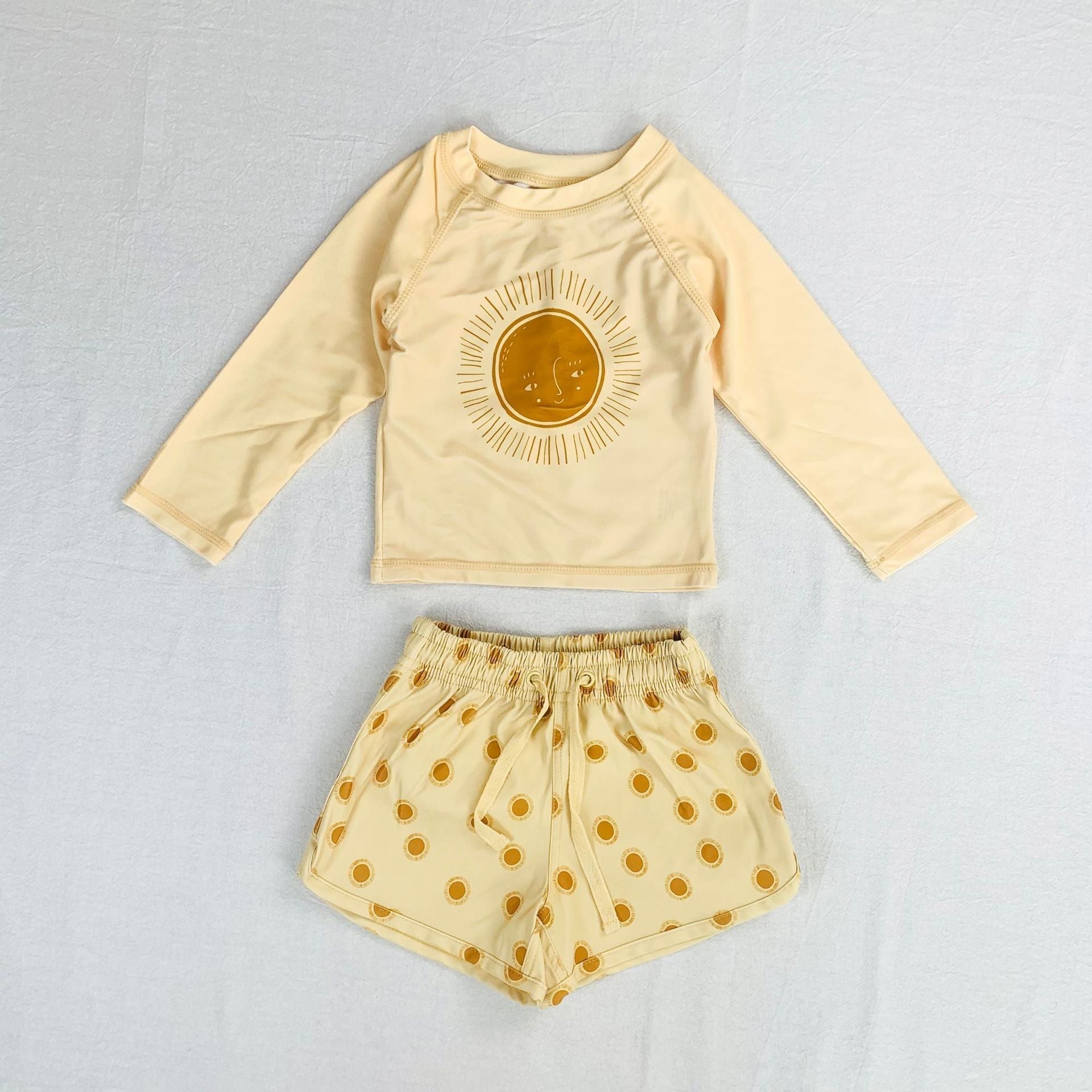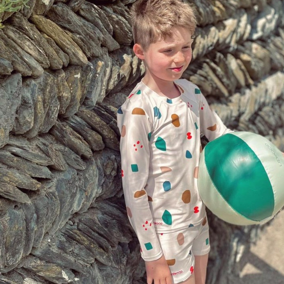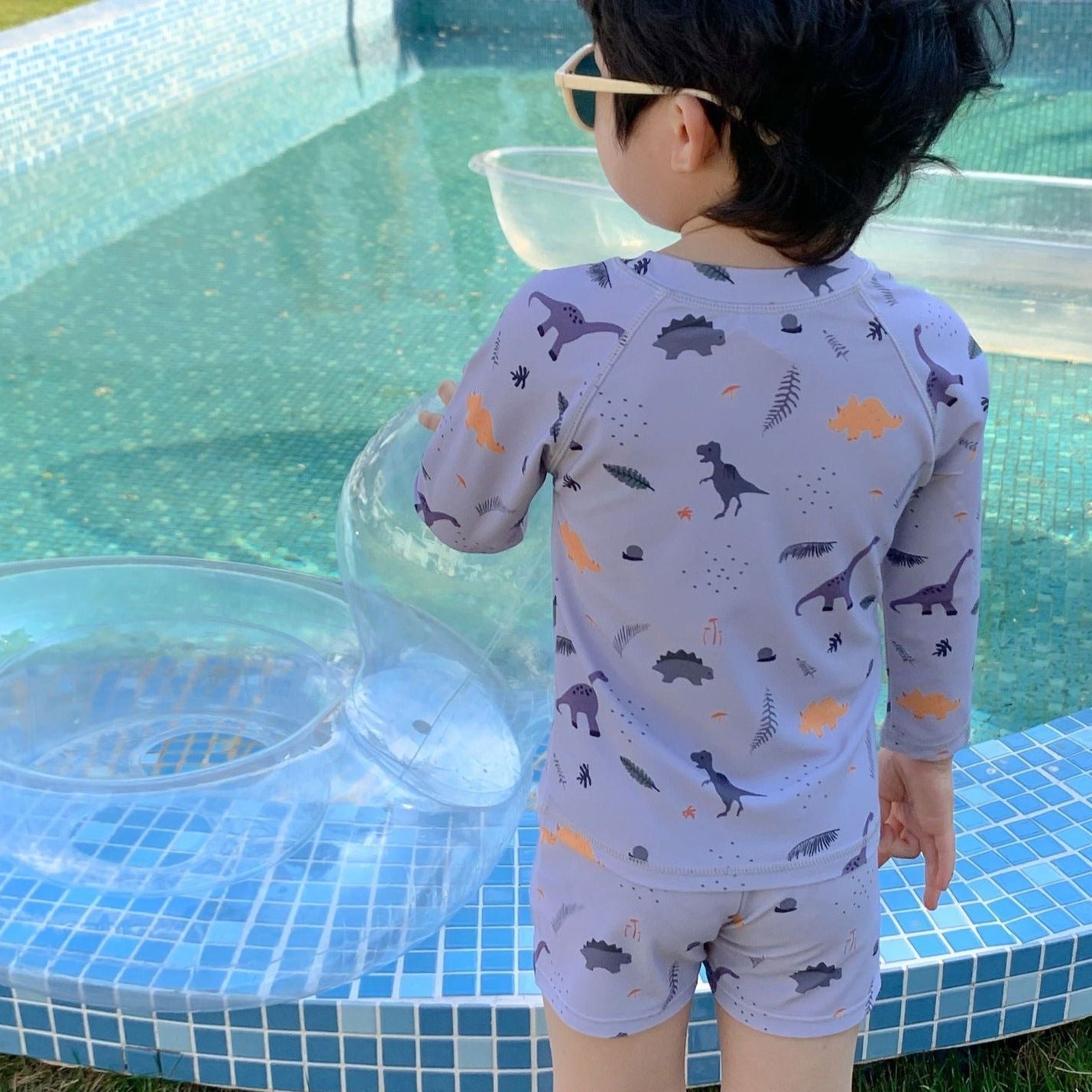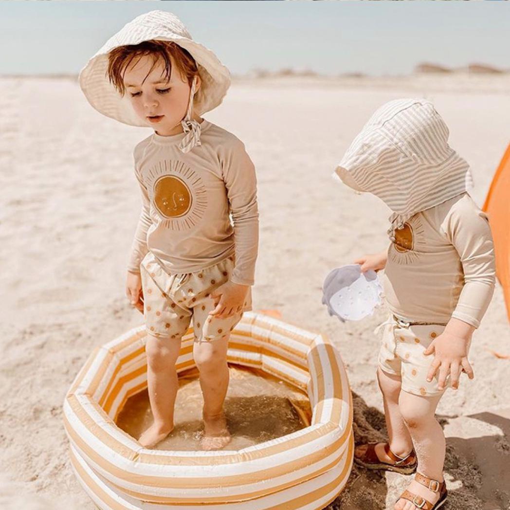 Tyto viditelné plavky jsou ideální pro nejmenší, kteří milují čas u vody. Tento letní outfit v sobě spojuje funkčnost a styl. Vrchní díl je navržen tak, aby chránil citlivou dětskou pokožku před škodlivým slunečním zářením. Dlouhé rukávy poskytují plnou ochranu paží a umožňují bezpečné opalování. Kraťasy zaručují pohodlí při hraní ve vodě.