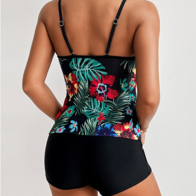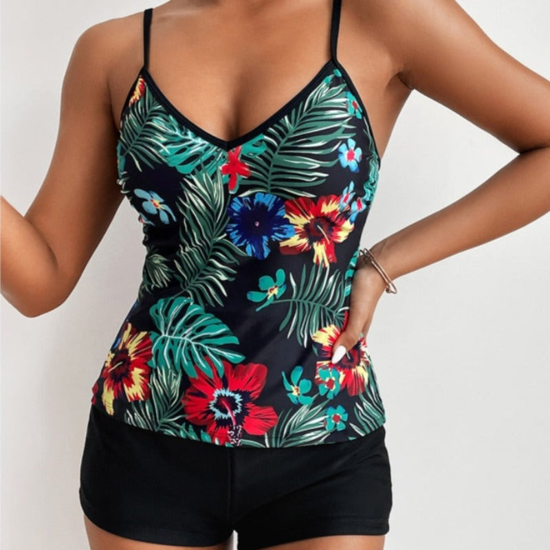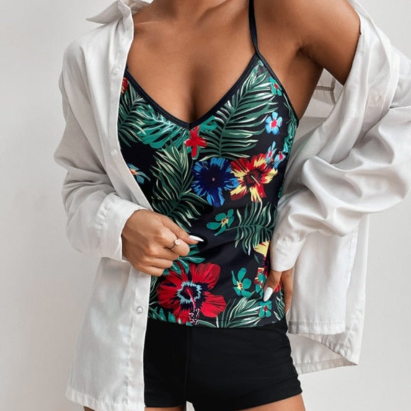Tyto dvoudílné tankiny se skládají z topu a kraťasů. Květinový potisk dodává plavkům sváteční a letní nádech. Podprsenka je top, který zakrývá celé břicho a zároveň odhaluje ramena. Ramínka jsou tenká, což vytváří lehký a jemný efekt. Spodní díl je kraťasový, který zajišťuje pohodlí při aktivitách u vody a na pláži. Charakteristickým prvkem těchto plavek je dlouhý top, který zakrývá břicho a zároveň jim dodává stylový nádech.