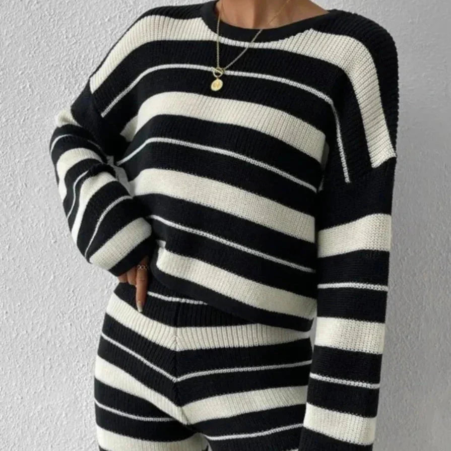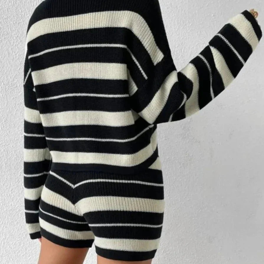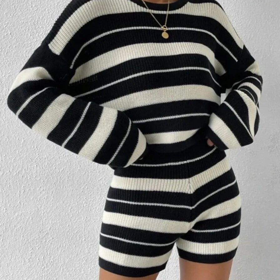 Představujeme pletenou soupravu domácího oblečení s kontrastními pruhy, ideální pro každodenní relaxaci i na podzimní a zimní večery. Tato černá souprava s kulatým výstřihem, dlouhými rukávy a kraťasy je vyrobena z pohodlného úpletu, který vás zahalí do tepla a pohodlí.