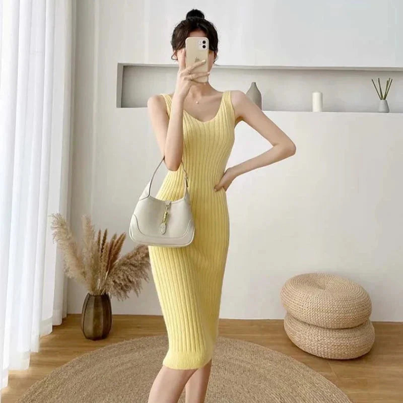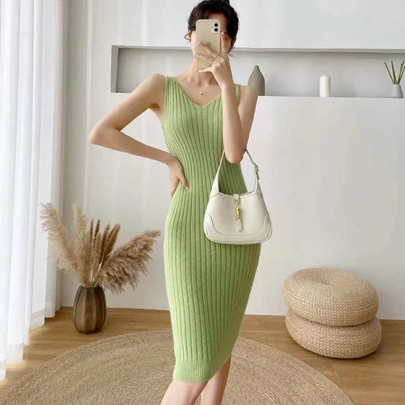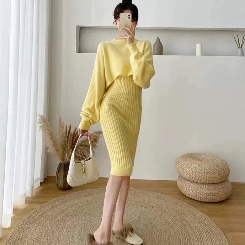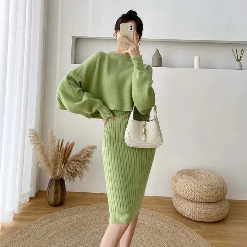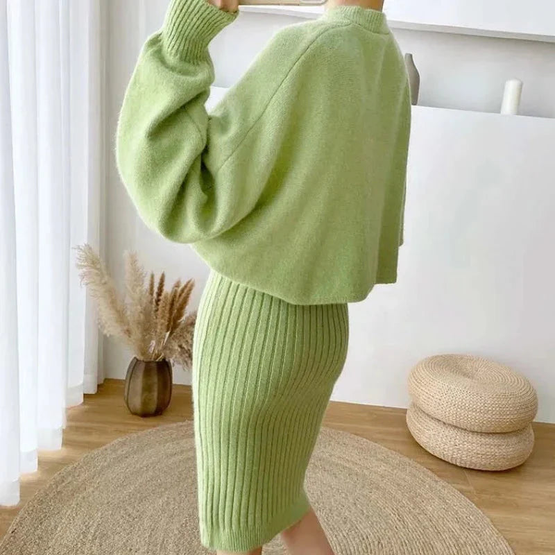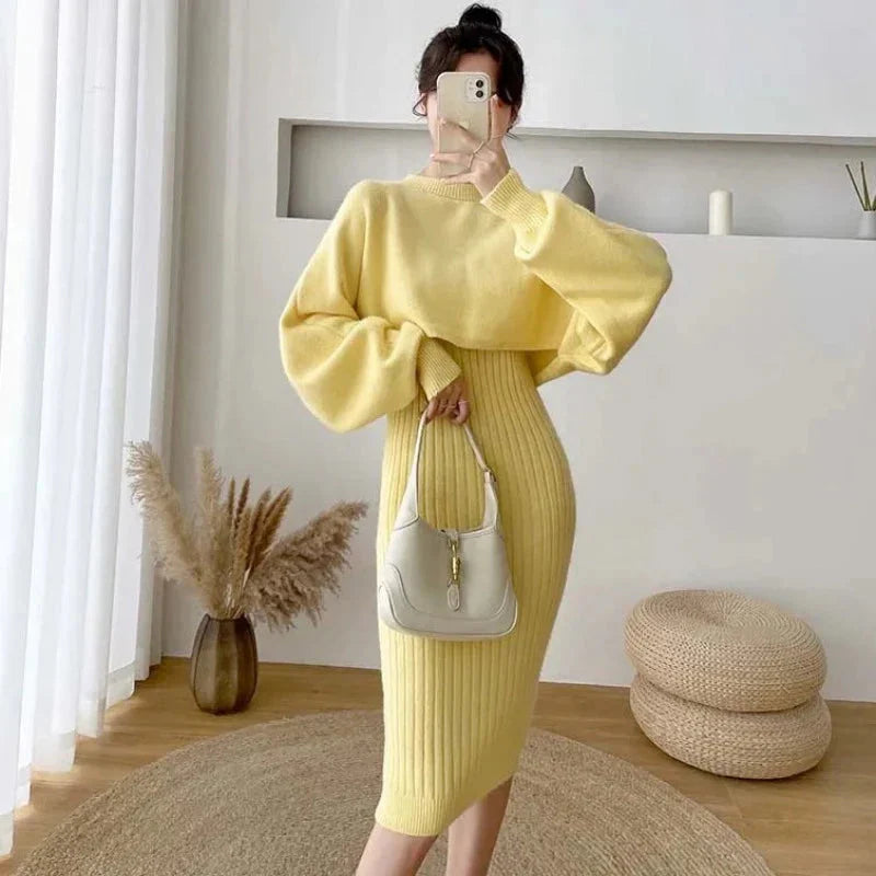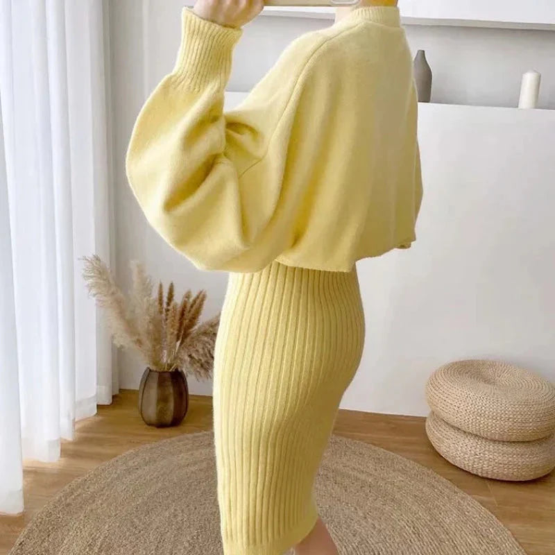 Představujeme vám pletenou sadu domácího oblečení s elegantními šaty, ideální pro chladnější podzimní a zimní dny. Tato elegantní sada s kulatým výstřihem, dlouhými rukávy a žebrovanými midi šaty v tlumených odstínech béžové, zelené, žluté a modré kombinuje pohodlí s decentností.