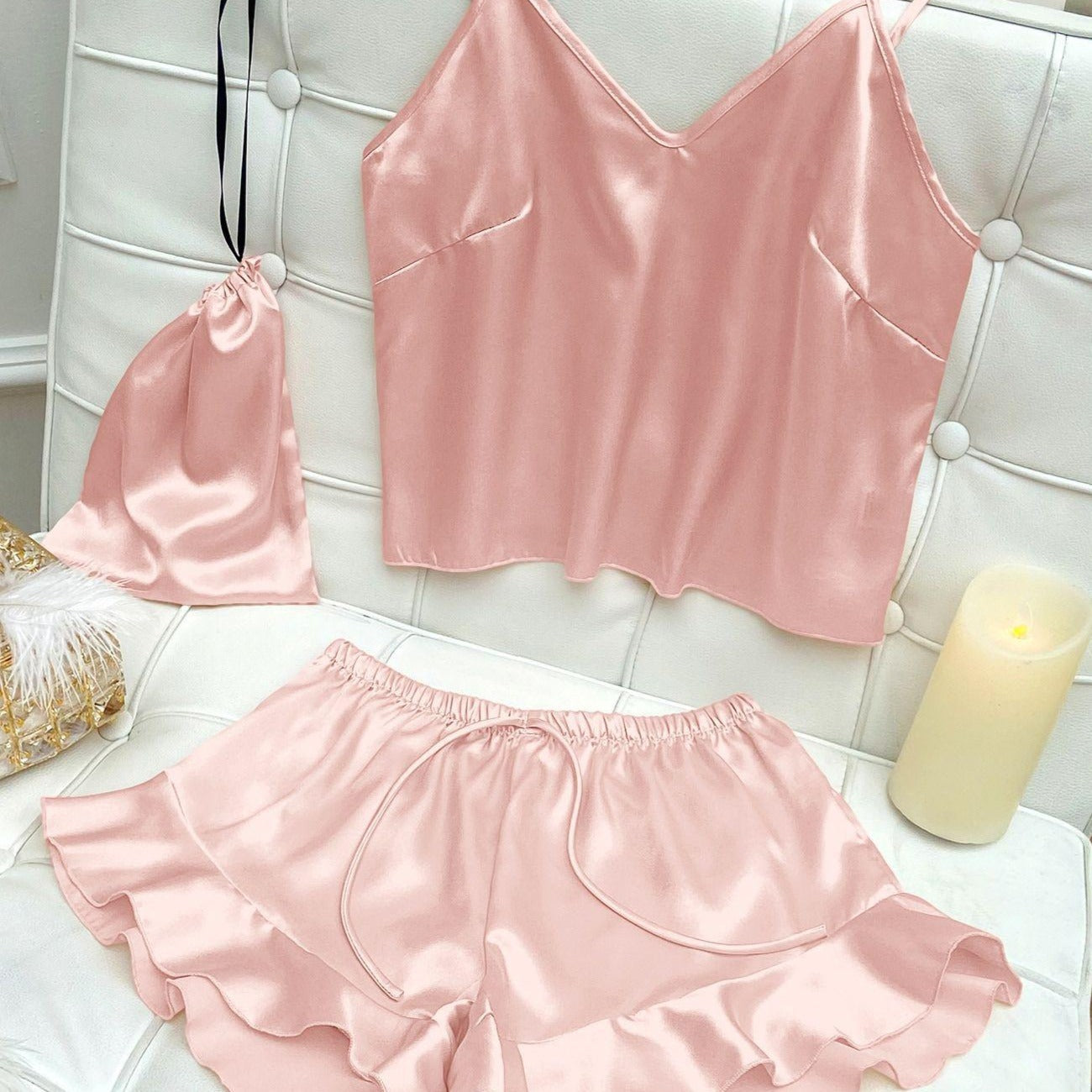 Hladké saténové pyžamo pro ženy s volánky