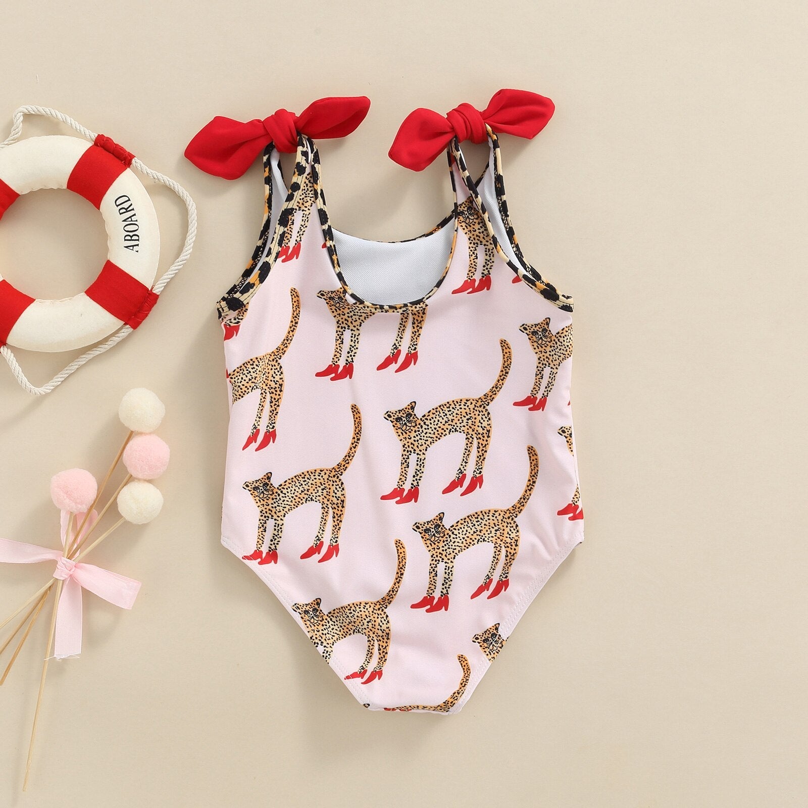 Tyto rozkošné dívčí plavky s leopardím vzorem jsou nezbytností pro každou módní slečnu, která chce na pláži nebo u bazénu vypadat sladce a hravě. Zdobené červenými mašlemi na ramenou a elegantním leopardím lemováním, tyto plavky jistě upoutají pozornost a poskytnou pohodlí při hraní ve vodě. Vyrobené z nejkvalitnějších materiálů, tyto plavky zaručují pohodlí a odolnost, takže vaší slečně vydrží po mnoho let.