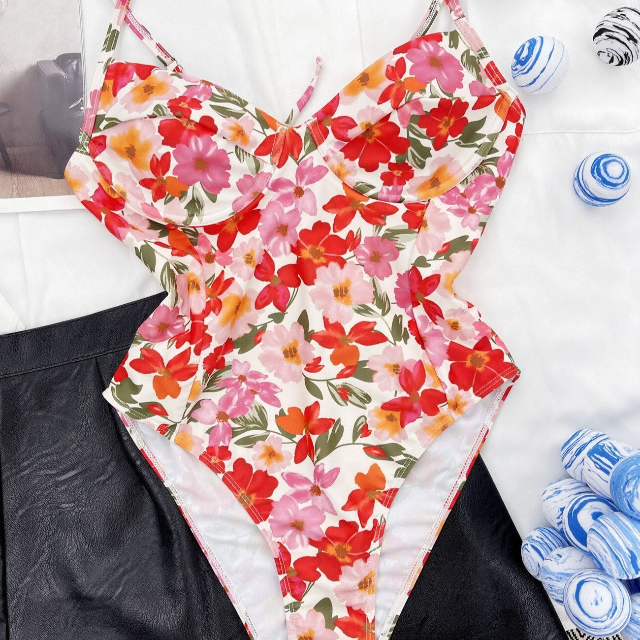 Klasické jednodílné plavky s květinovým vzorem a zavazováním