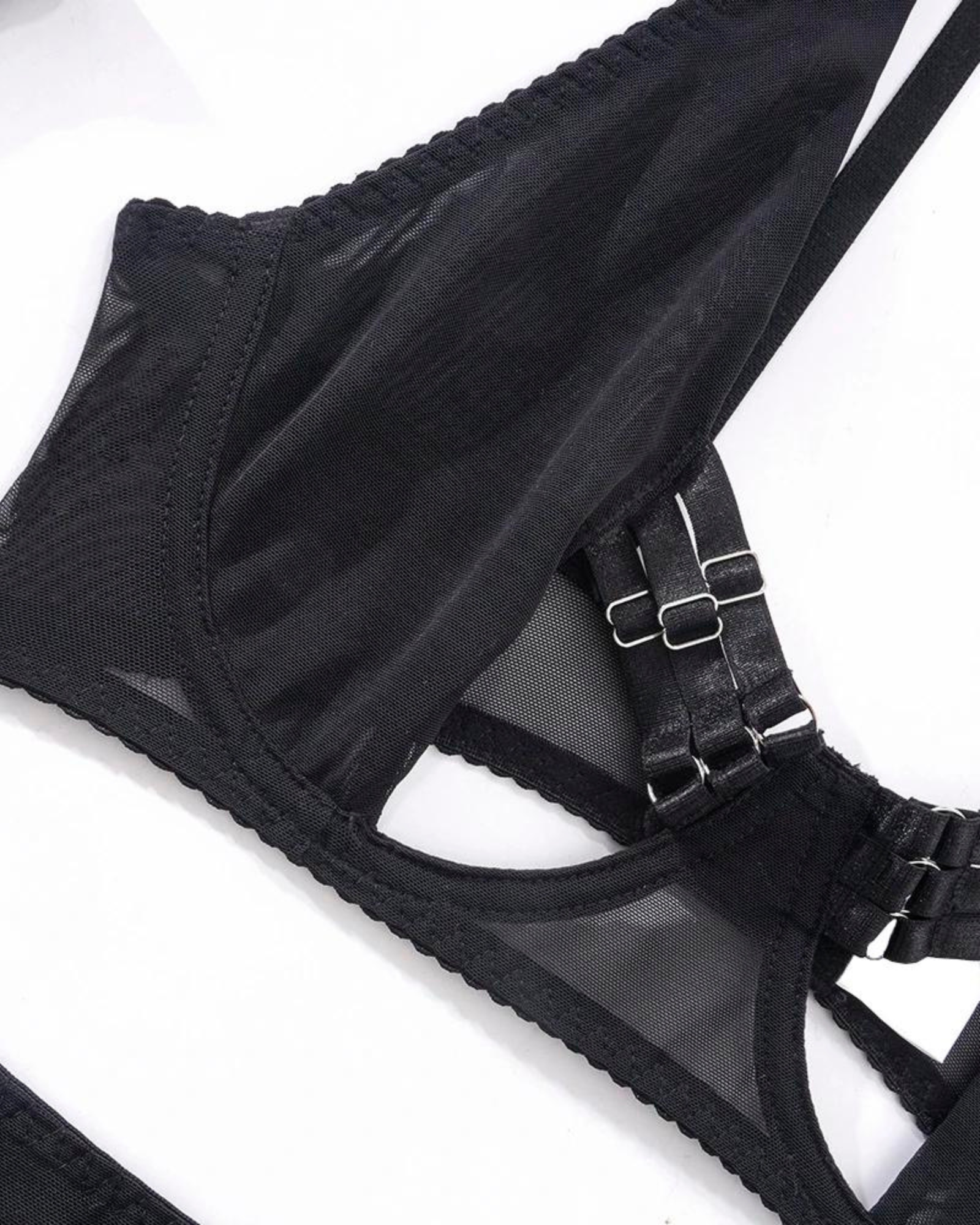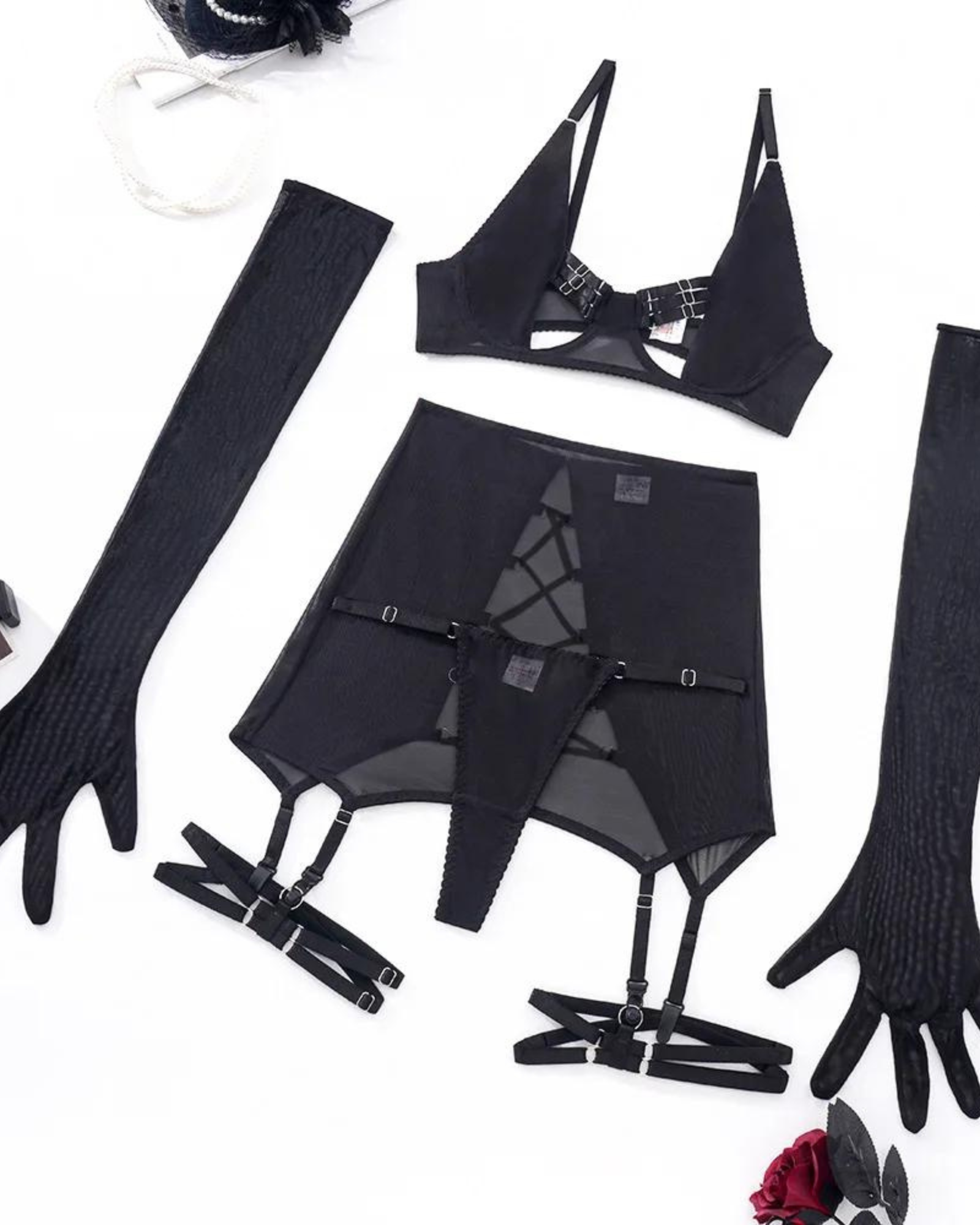 Sada obsahuje také dlouhé, průsvitné rukavice a elegantní síťovanou sukni s podvazkovým pásem, které dodávají sadě nádech tajemna a sex-appealu. Každý kus je navržen s ohledem na vaše pohodlí a luxus, abyste se v každém okamžiku cítili výjimečně.