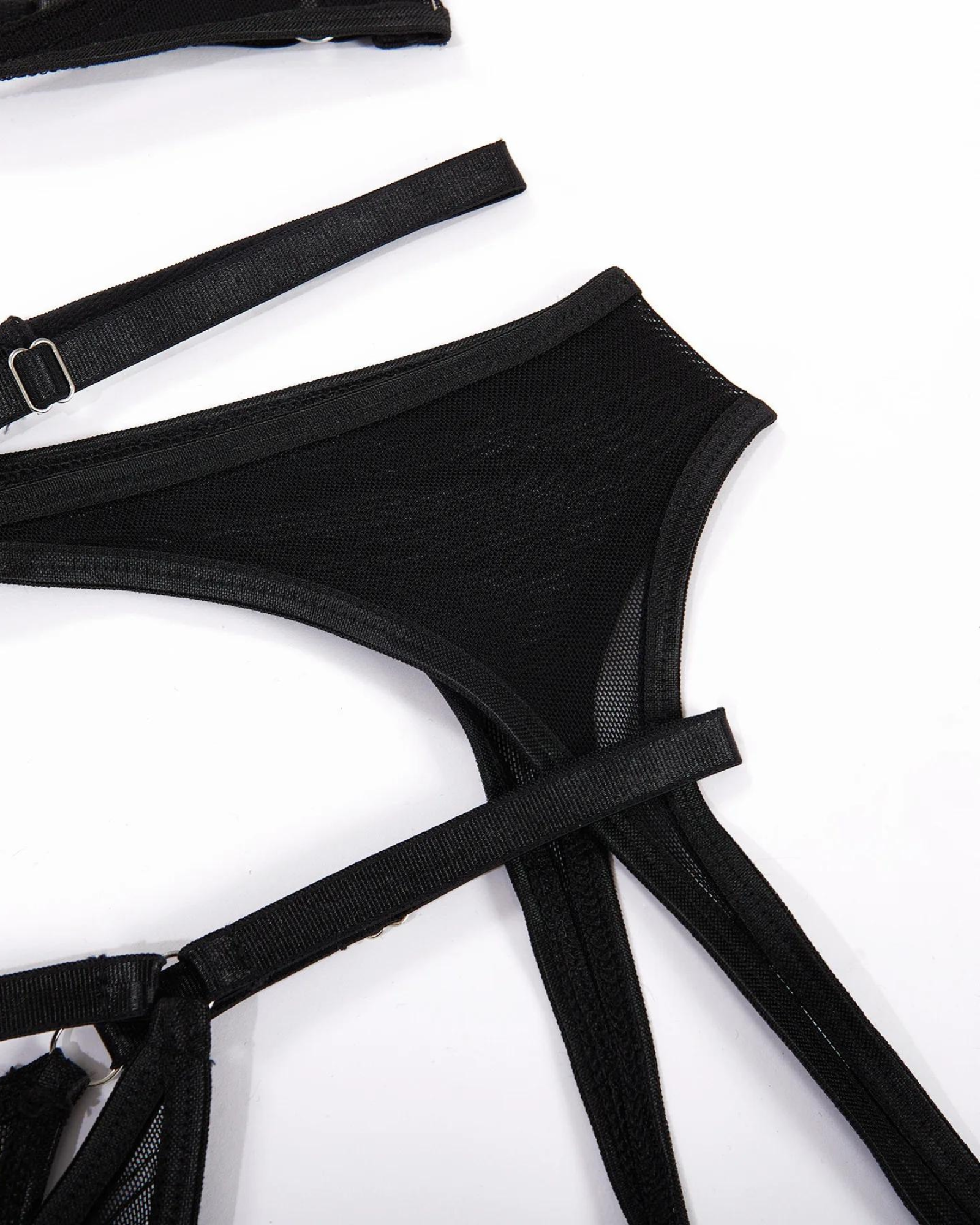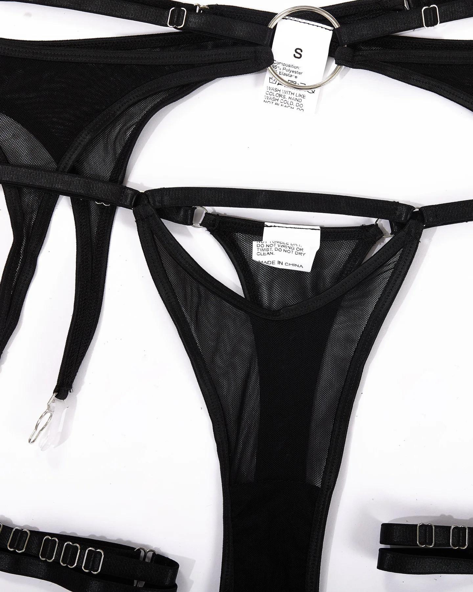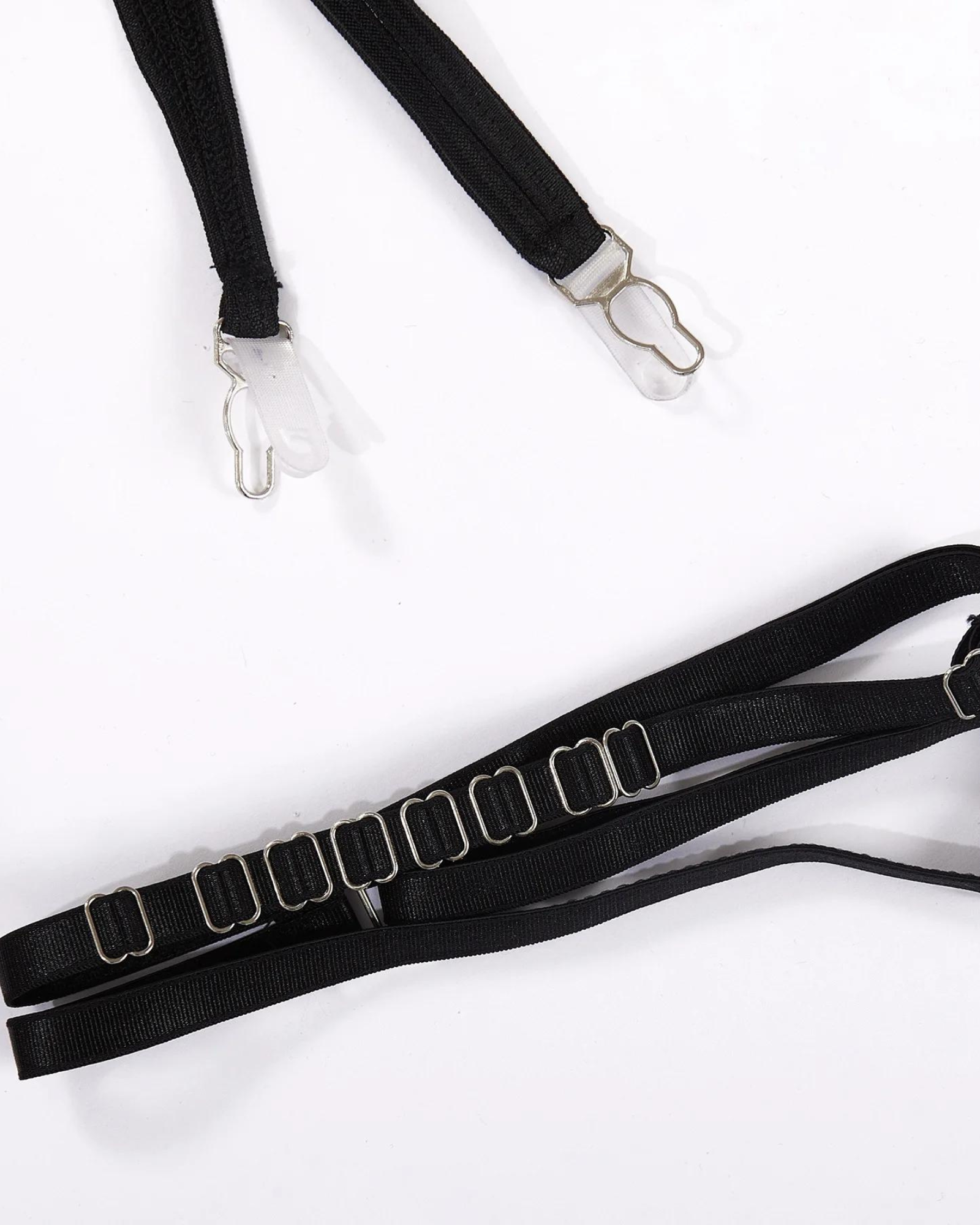 Cítíte se neuvěřitelně sexy a sebejistě v této sadě spodního prádla, která kombinuje výrazný design s rafinovanou elegancí. Tato unikátní sada obsahuje podprsenku, kalhotky, podvazkový pás a stehenní ramínka, které vytvářejí jedinečnou kompozici, jež zdůrazní vaše ženské křivky.