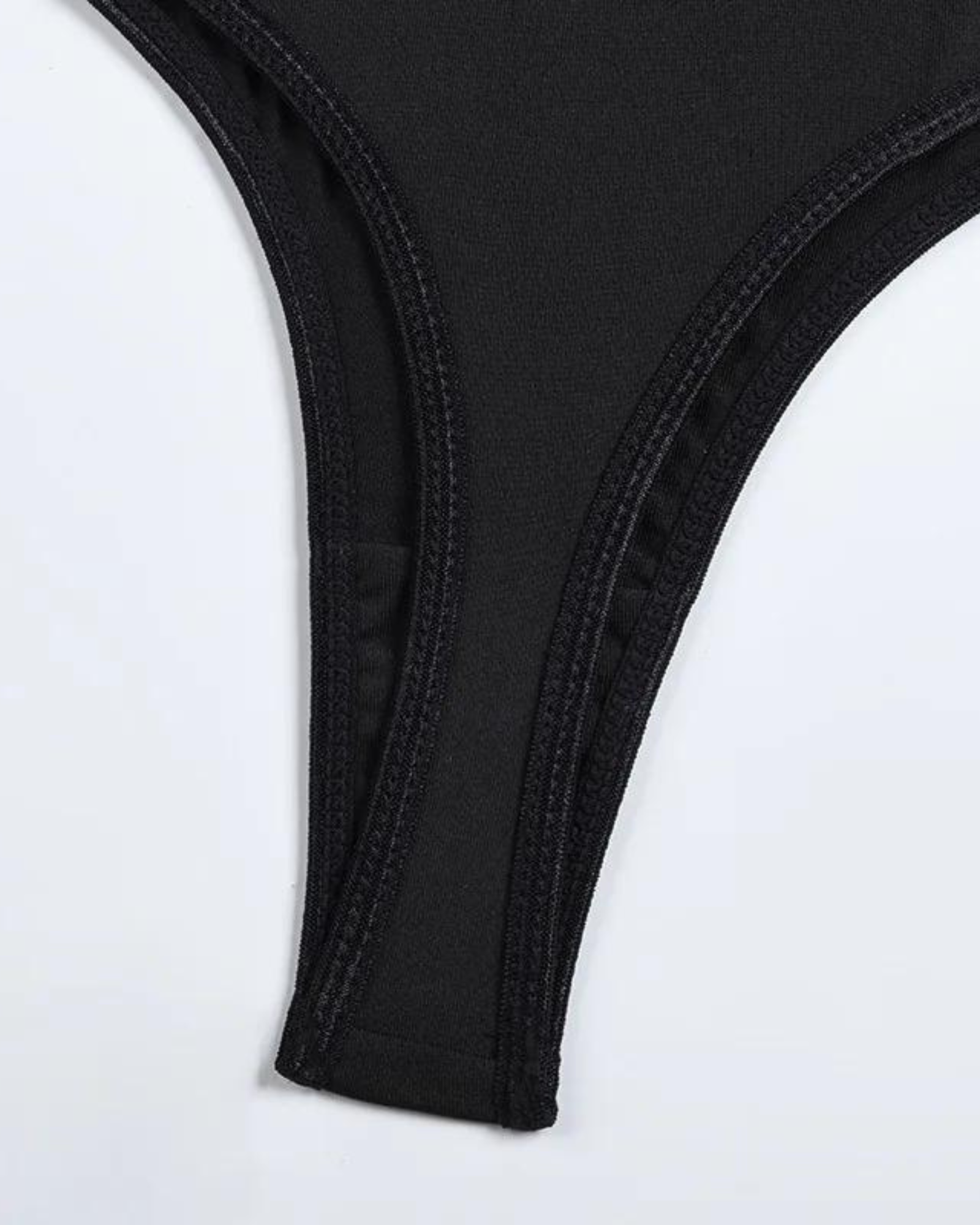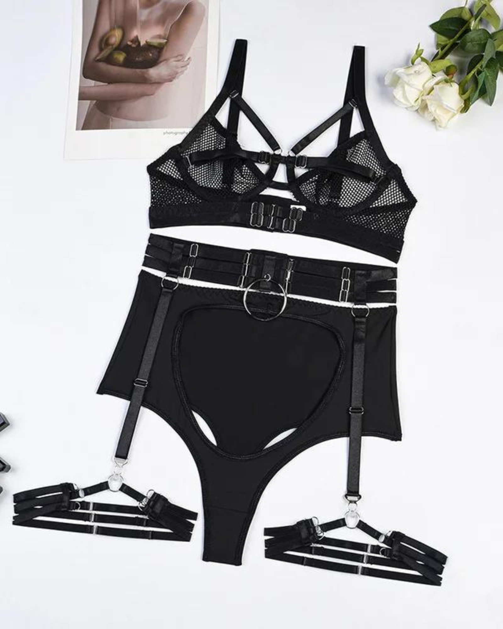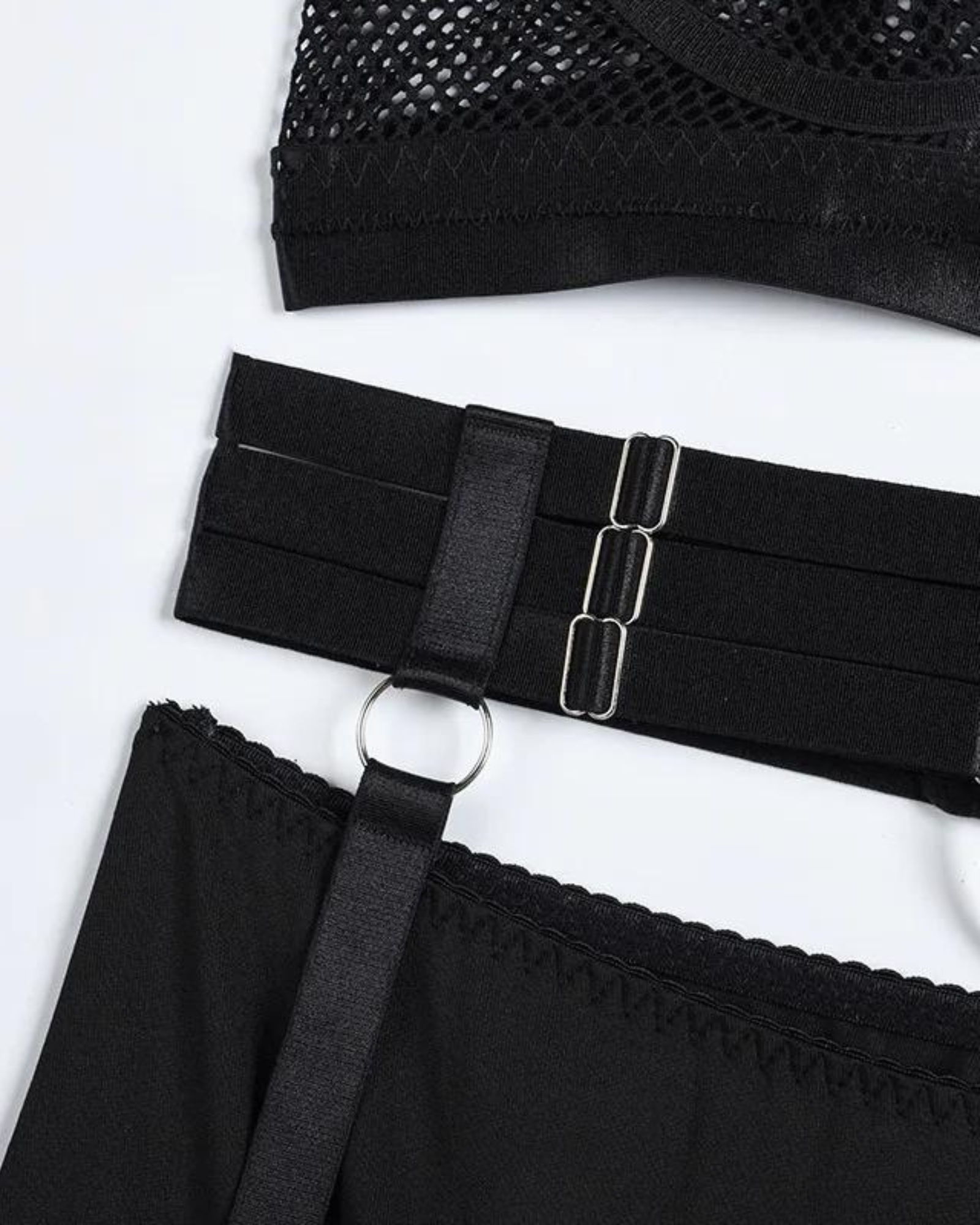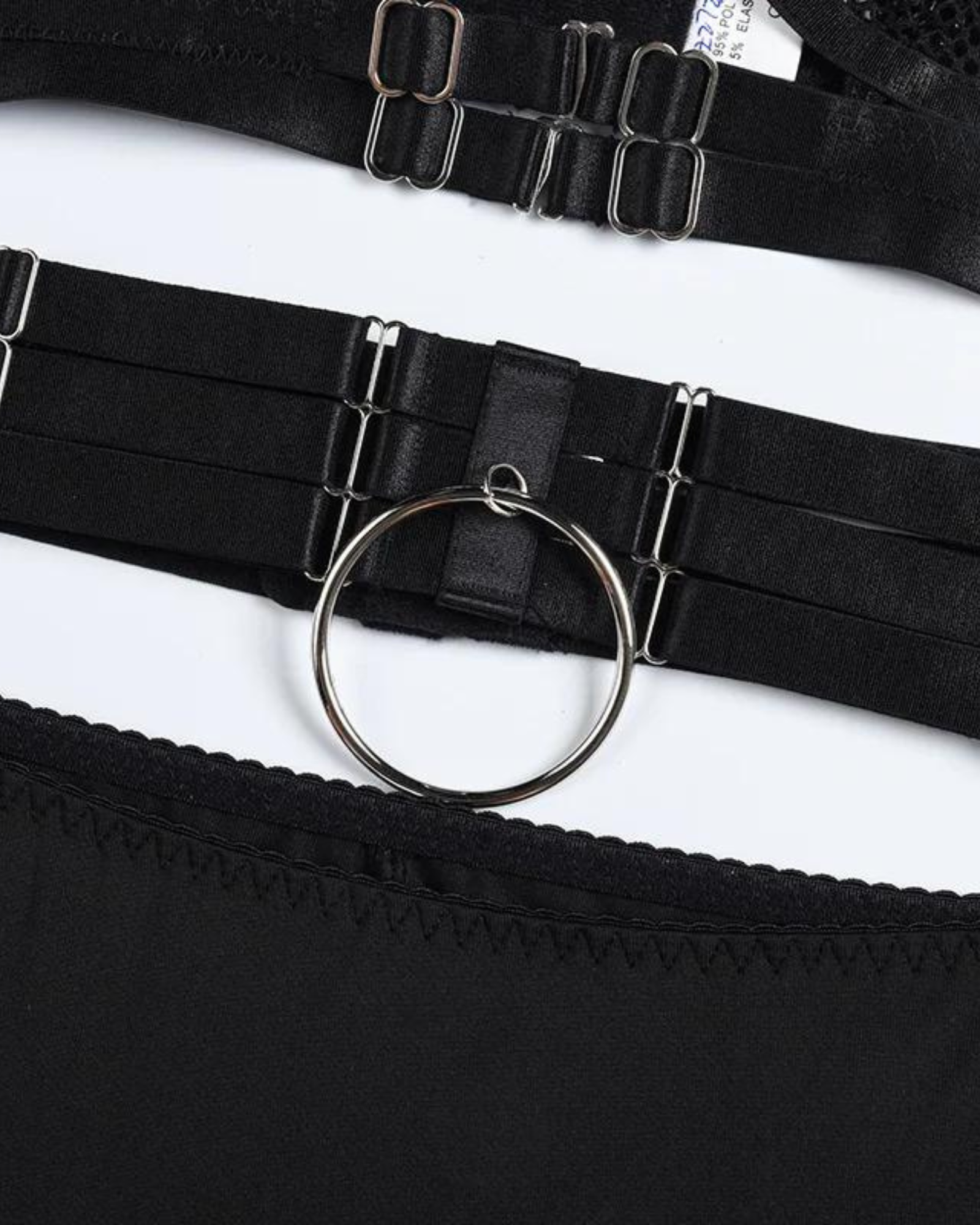 Kalhotky s vysokým pasem, výrazným výstřihem a kovovým kroužkem dokonale doplňují podprsenku a vytvářejí smyslný celek. Podvazkový pás a další ramínka na stehnech dodávají soupravě eleganci a jedinečný charakter, díky čemuž vypadá celá souprava úžasně.