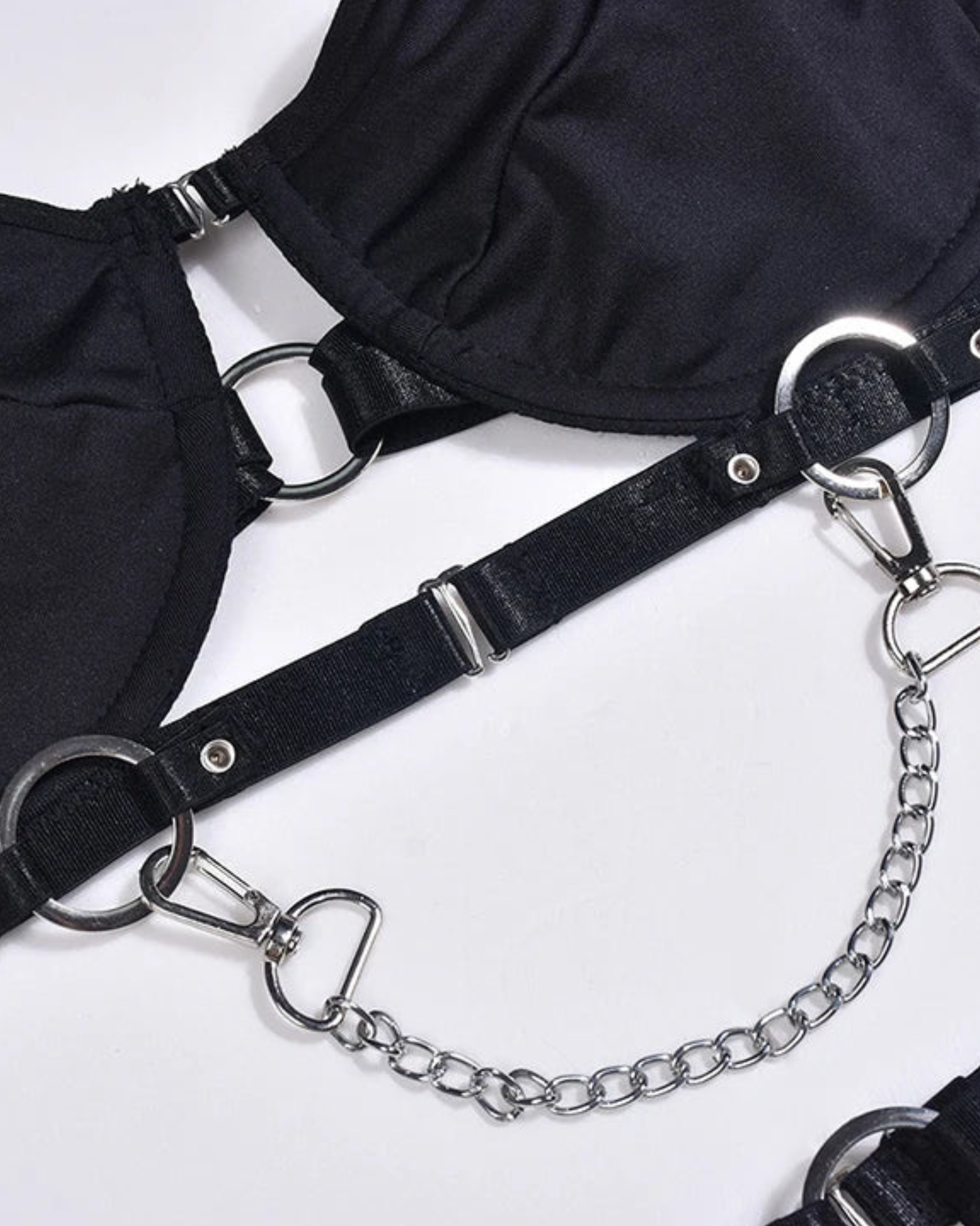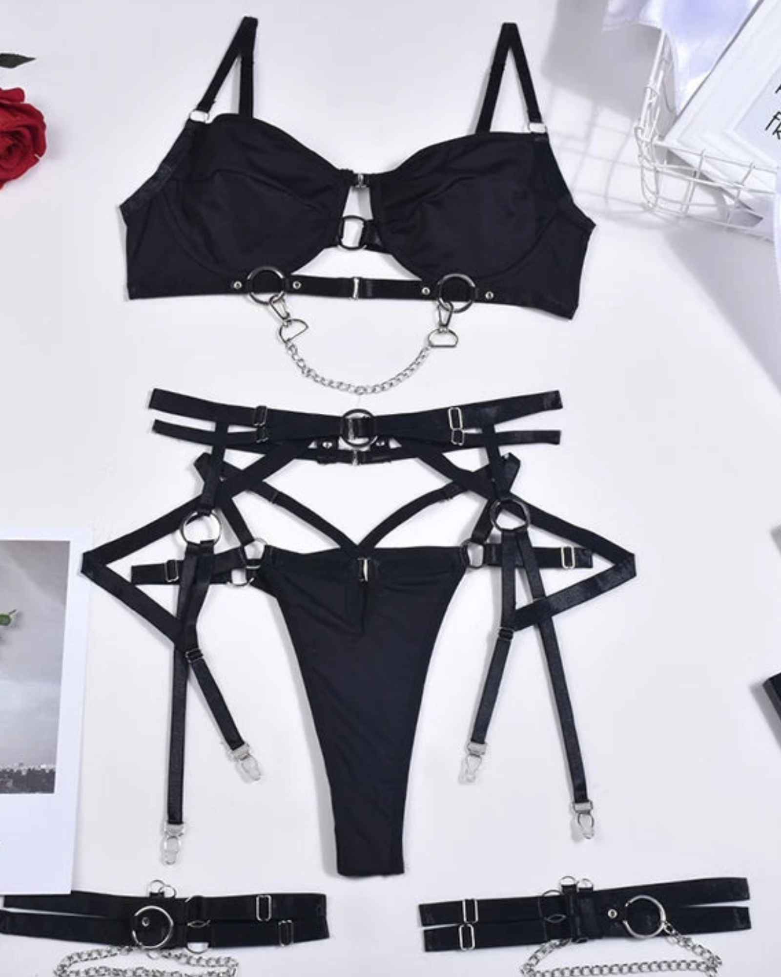 Zdůrazněte svou smyslnost a sebevědomí s touto jedinečnou sadou spodního prádla, vytvořenou pro ženy, které se chtějí cítit výjimečně v každé situaci. Nastavitelná ramínka a výrazné kovové řetízky dodávají celé sadě jedinečný charakter, přitahují pozornost a vyzdvihují vaše přednosti.