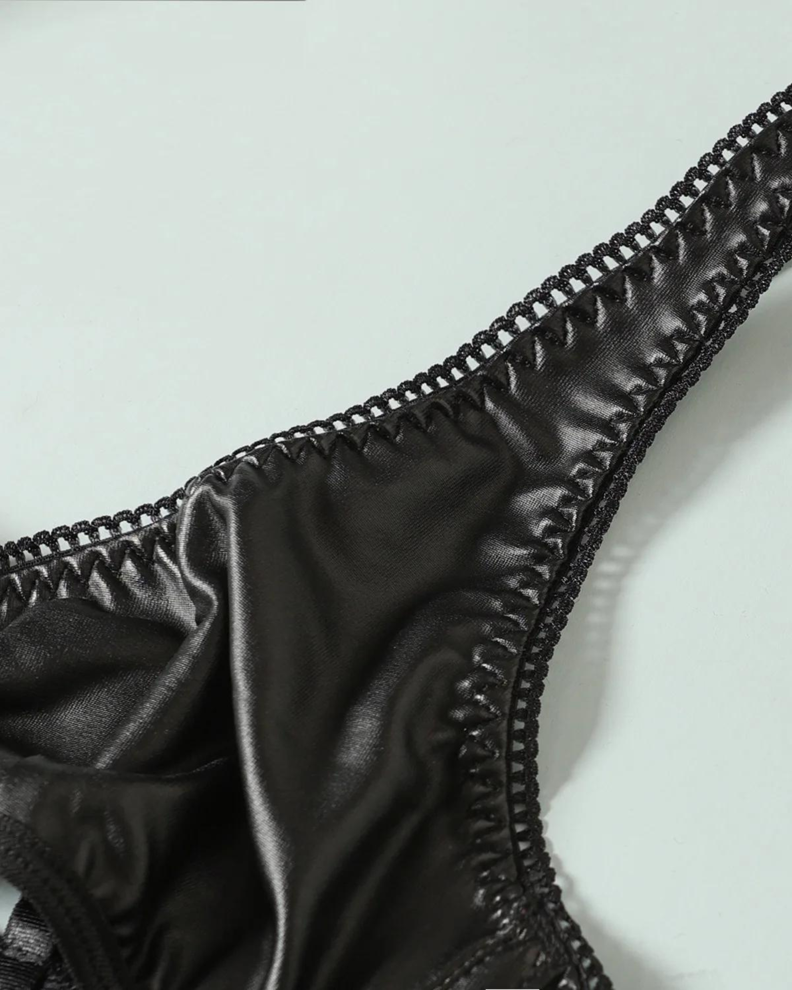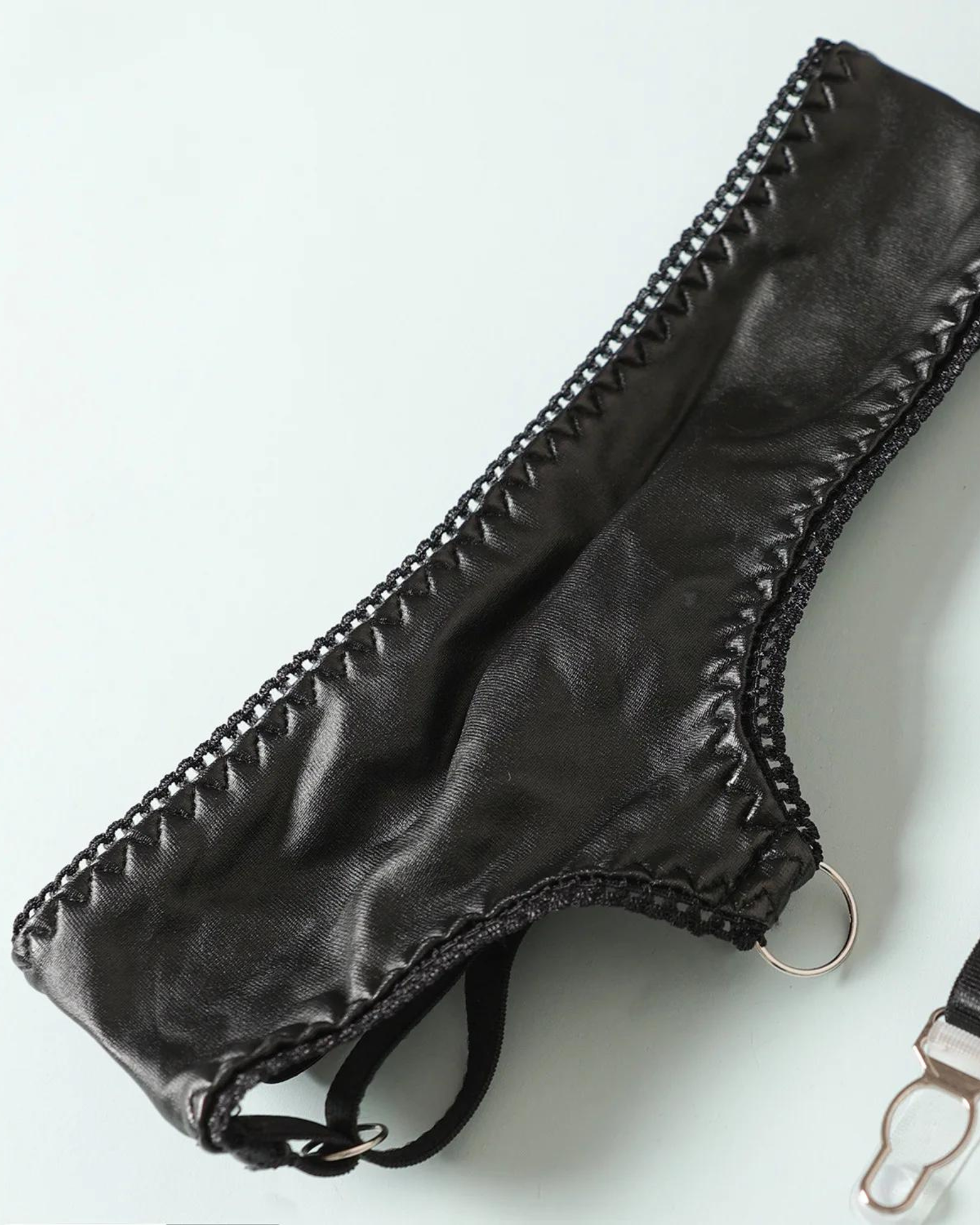 Kalhotky a podvazkový pás, rovněž vyrobené z imitace kůže, dokonale doplňují podprsenku. Další stehenní ramínka dodávají podprsence nádech pikantnosti a jedinečného charakteru. Vysoce kvalitní materiály a precizní zpracování zajišťují odolnost a pohodlí.