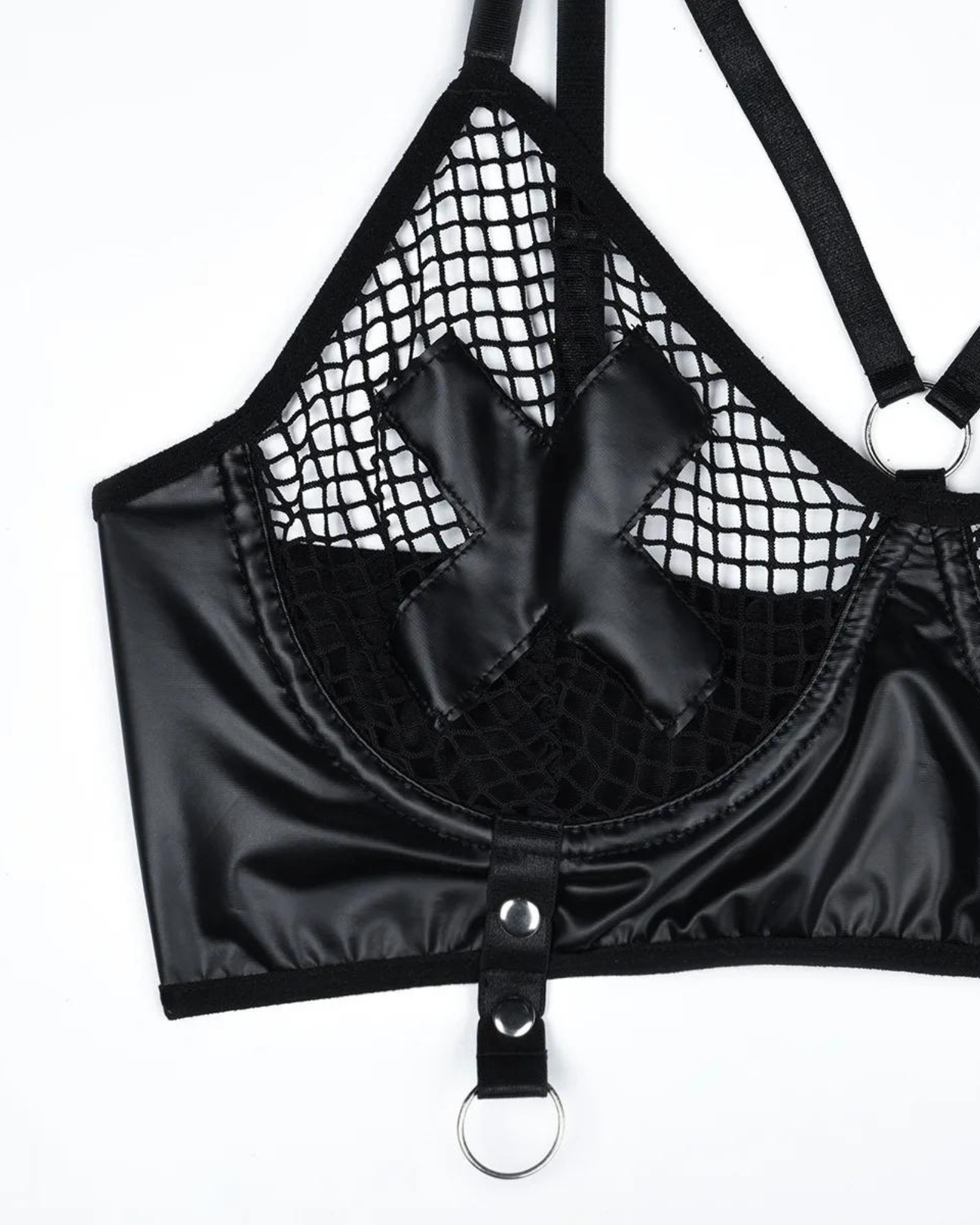 Tato síťovaná podprsenka s ozdobnými křížky na bradavkách dokonale zvýrazňuje poprsí a dodává mu jemnost a sexuální přitažlivost. Kožené akcenty a kovové detaily jí dodávají moderní nádech a nastavitelná ramínka zajišťují perfektní střih.