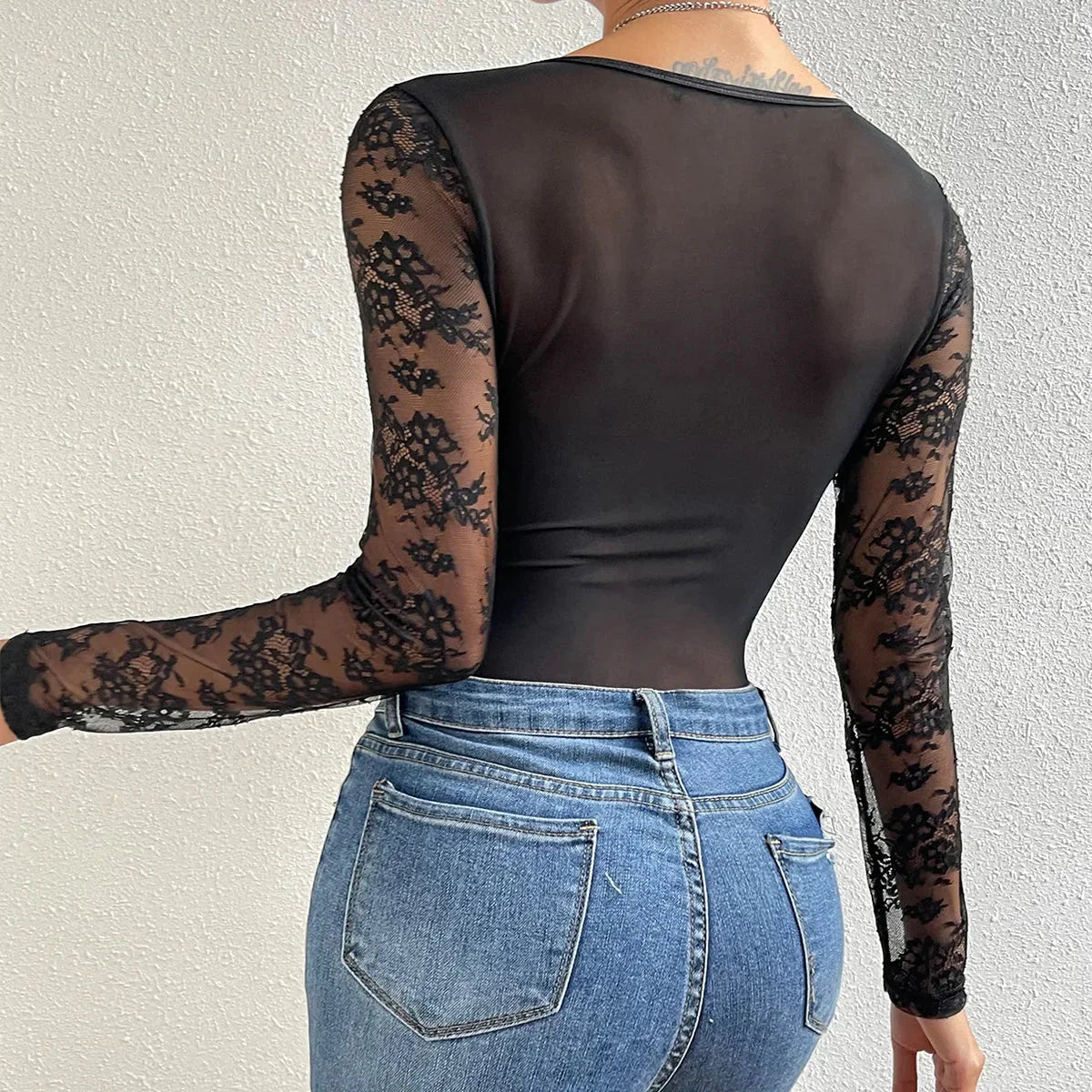 Dámské krajkové body s dlouhým rukávem a síťovinou