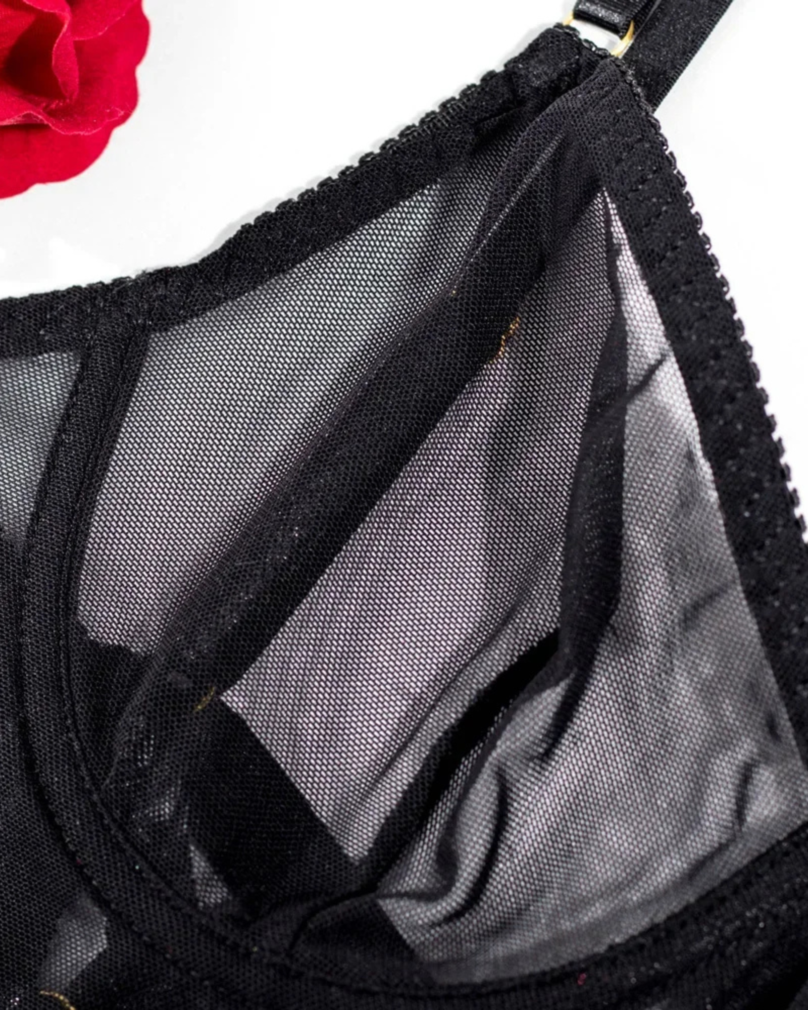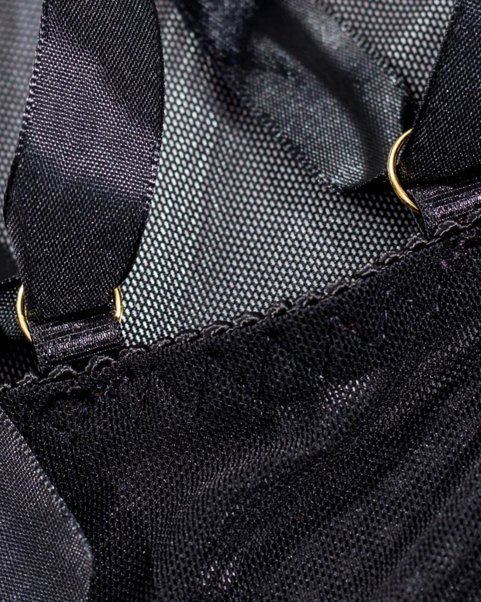 Tento design harmonicky spojuje eleganci s nádechem provokace a proměňuje každou noc v tajemný a smyslný zážitek. Dlouhé černé rukavice, které jsou součástí sady, ještě více umocňují její luxusní charakter.