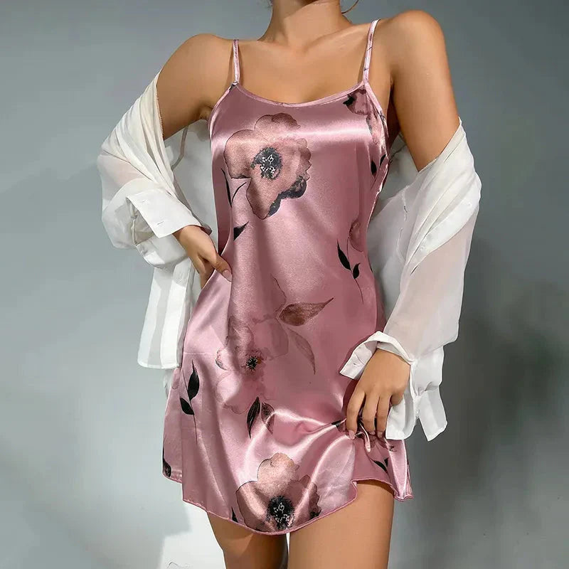 Krátká saténová noční košilka s květinovým motivem