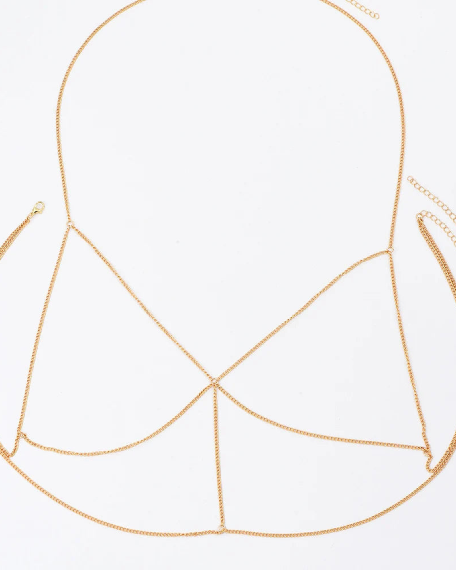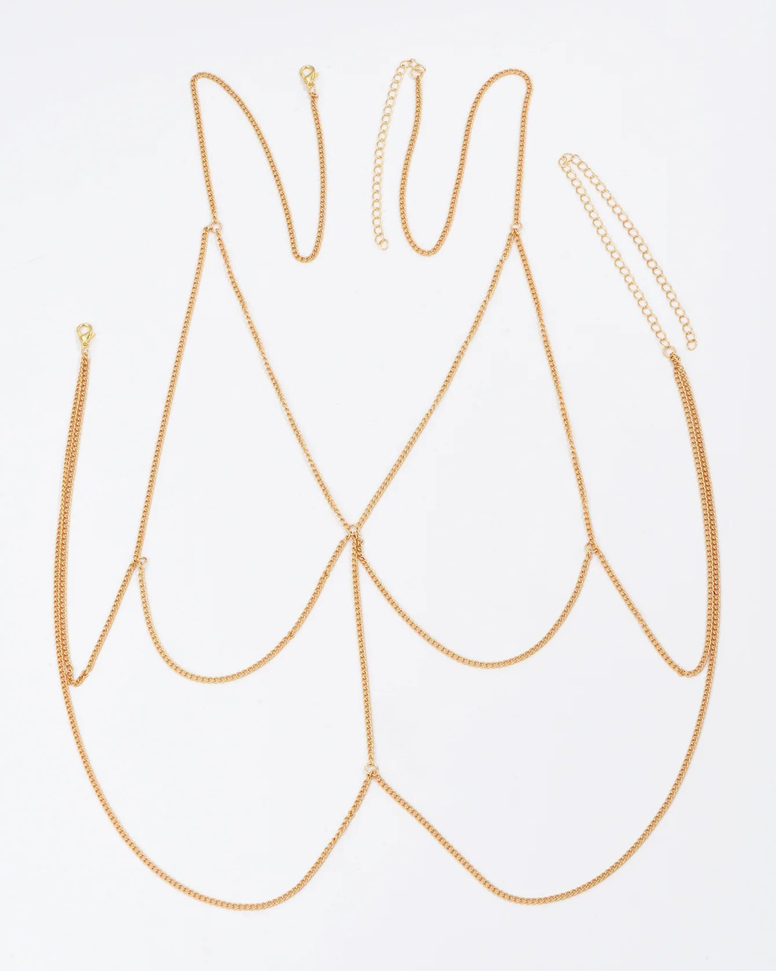 Tento řetízek je jedinečným doplňkem, který zvýrazní vaše nejlepší rysy a dodá vašemu vzhledu eleganci a jemnost. Zlaté řetízky se jemně ovíjejí kolem těla a vytvářejí delikátní strukturu, která přitahuje pozornost a okouzluje sofistikovaností. Díky nastavitelné sponě se řetízek dokonale přizpůsobí vaší postavě a jedinečným způsobem zvýrazní váš krk a dekolt.