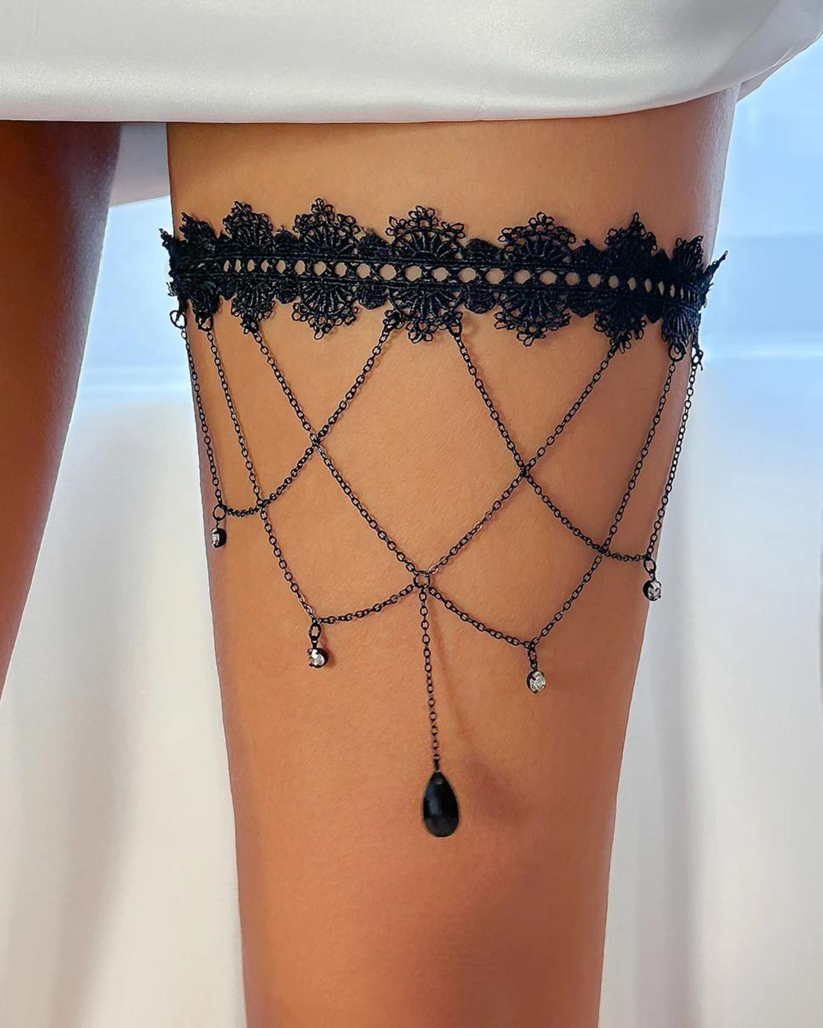 Tento řetízkový náhrdelník je perfektní volbou pro ty, které chtějí svému outfitu dodat nádech tajemství a elegance. Krajkové detaily decentně obepínají stehna, zatímco jemné řetízky s křišťálovými akcenty přitahují pozornost. Tento jedinečný doplněk zdůrazní vaši individualitu a posílí vaše sebevědomí.