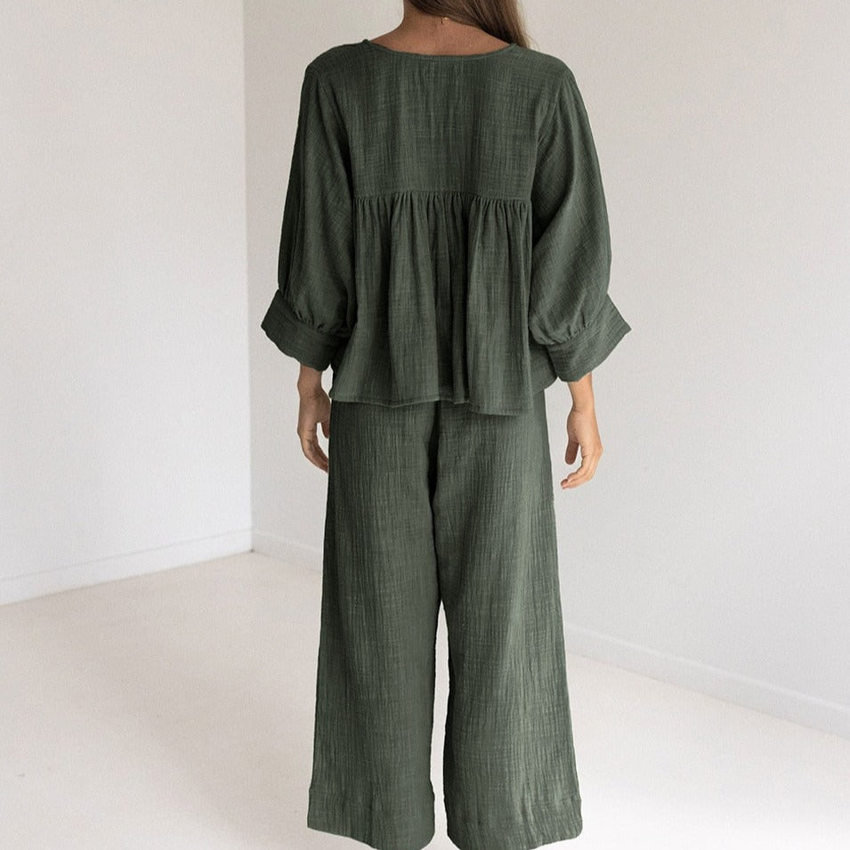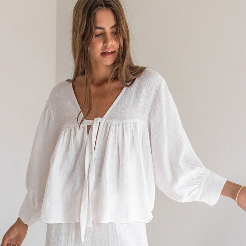 Naše volná bavlněná domácí souprava se zavazováním je ztělesněním relaxace a stylu, ideální pro každou příležitost a roční období. Její jedinečný design umožňuje naprostou volnost pohybu a jemný výstřih s zavazováním dodává soupravě nádech šarmu.