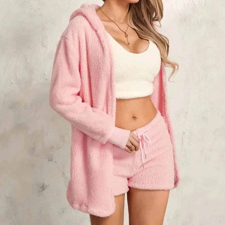 Představujeme vám tuto výjimečně měkkou třídílnou sadu kardiganů na doma, která je ideální pro každodenní nošení i relaxaci v chladnějších podzimních a zimních dnech. Tato sada v pastelových odstínech růžové, tmavě černé a smyslné fialové s kulatým výstřihem, dlouhými rukávy, kraťasy a kapucí se zavazováním vpředu vnese do vašeho domova pohodlí i styl.